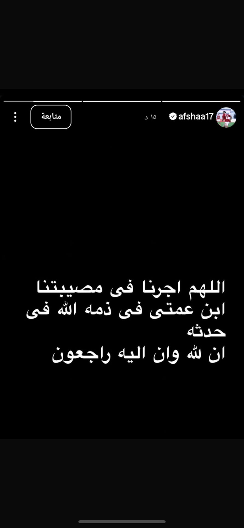 وكتب أفشة عبر استوري عبر حسابه على موقع التواصل الاجتماعي انستجرام :"اللهم أجرنا في مصيبتنا ابن عمتي في ذمة الله حادثه إنا لله وإنا اليه راجعون ".