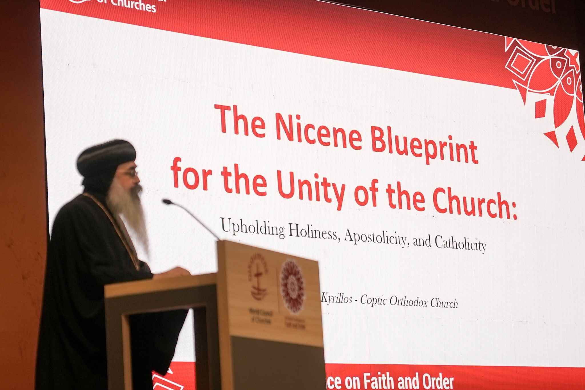 وحملت الورقة التي قدّمها نيافته عنوان "النهج النيقاوي لوحدة الكنيسة والتمسك بالقداسة والجامعة الرسولية"، حيث كشف عن أن الوحدة الخالدة التي نتجت عن مجمع نيقية لم تتحقق فقط بقانون الإيمان، وإنما لأنها مرتبطة ارتباطًا وثيقًا بسمات الكنيسة الجوهرية، بمعنى أن وحدانية الكنيسة تقوم على: قداستها وجامعيتها ورسوليتها.