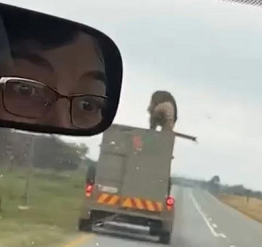وثّق أحد الركاب المسافرين على الطريق السريع R49 بين بيكرفيل وليشتنبورج لحظة قفز أسد ضخم من أعلى مقطورة كانت تسير على الطريق، حيث اصطدم الحيوان المفترس بالأرض قبل أن ينهض مسرعًا ويركض إلى جانب الطريق وسط دهشة المارة، وانتشر الفيديو سريعًا على مواقع التواصل الاجتماعي بعد أن نشرته صحيفة ديلي ميل البريطانية، ليُثير موجة من التعليقات المندهشة.