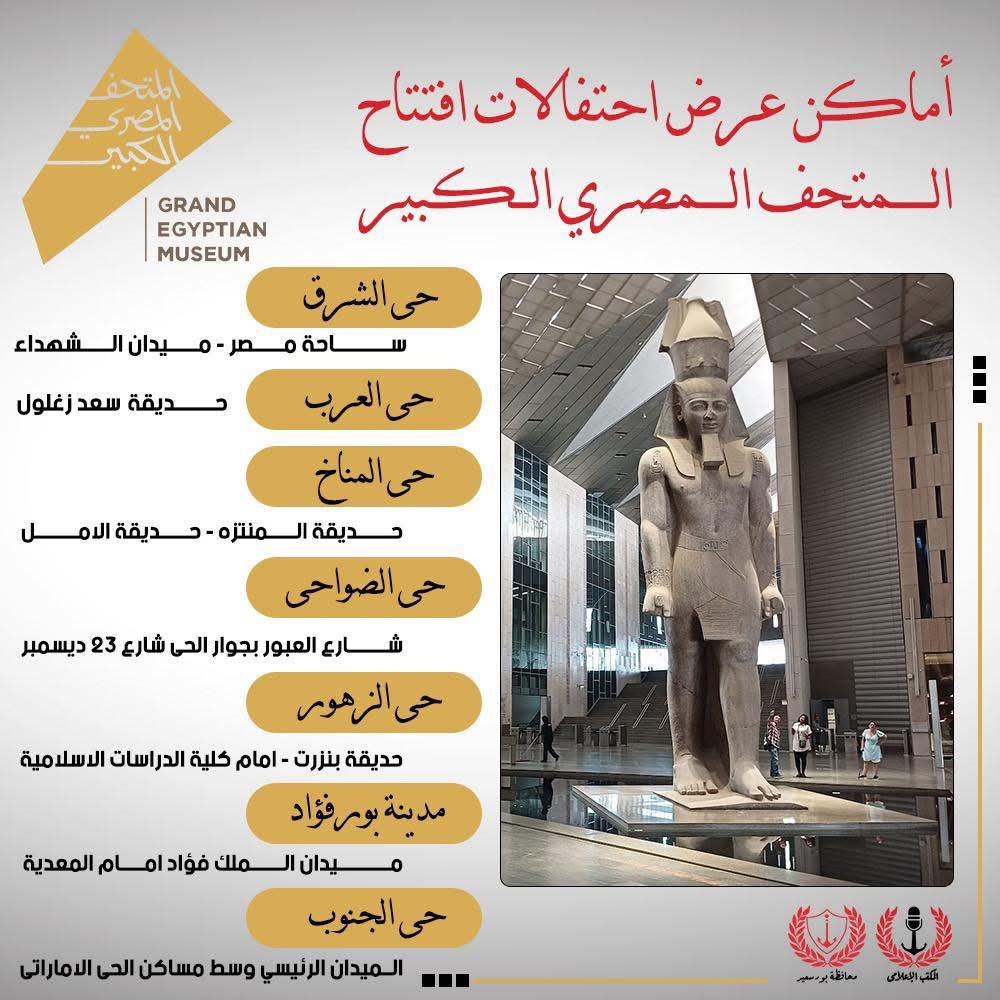 وكان اللواء أ.ح محب حبشي محافظ بورسعيد اعلن عن بدء تجهيز عدد من الميادين والساحات العامة بالمحافظة بشاشات عرض ضخمة لنقل فعاليات الاحتفال بافتتاح المتحف المصري الكبير بشكل مباشر على مدار اليوم وذلك في الأول من نوفمبر 2025، بما يتيح للمواطنين متابعة الحدث في أجواء احتفالية مبهجة.في إطار الحرص على مشاركة أبناء محافظة بورسعيد في الحدث التاريخي العالمي المتمثل في افتتاح المتحف المصري الكبير،