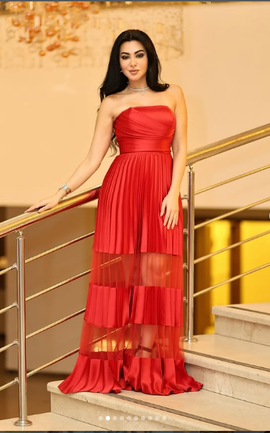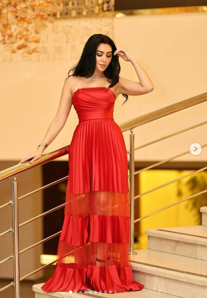 خطفت ميريهان حسين الأنظار في الصور بإطلالة راقية، حيث ارتدت فستانا طويلا ذا أكمام مكشوفة، واتسم التصميم باللون الأحمر المصنوع من القماش الستان.