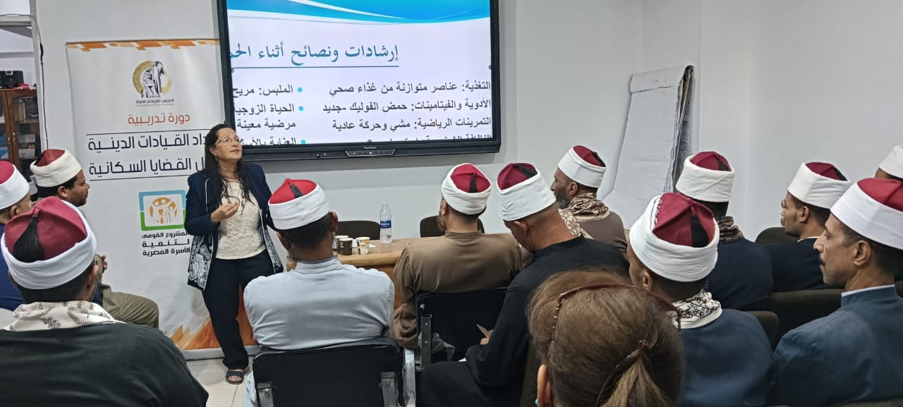 الختان، القضايا السكانية، والبرنامج التدريبى يتضمن إعداد الدعاة والقيادات الدينية لتناول القضايا السكانية والصحة من خلال جلسات الدوار بالقرى.