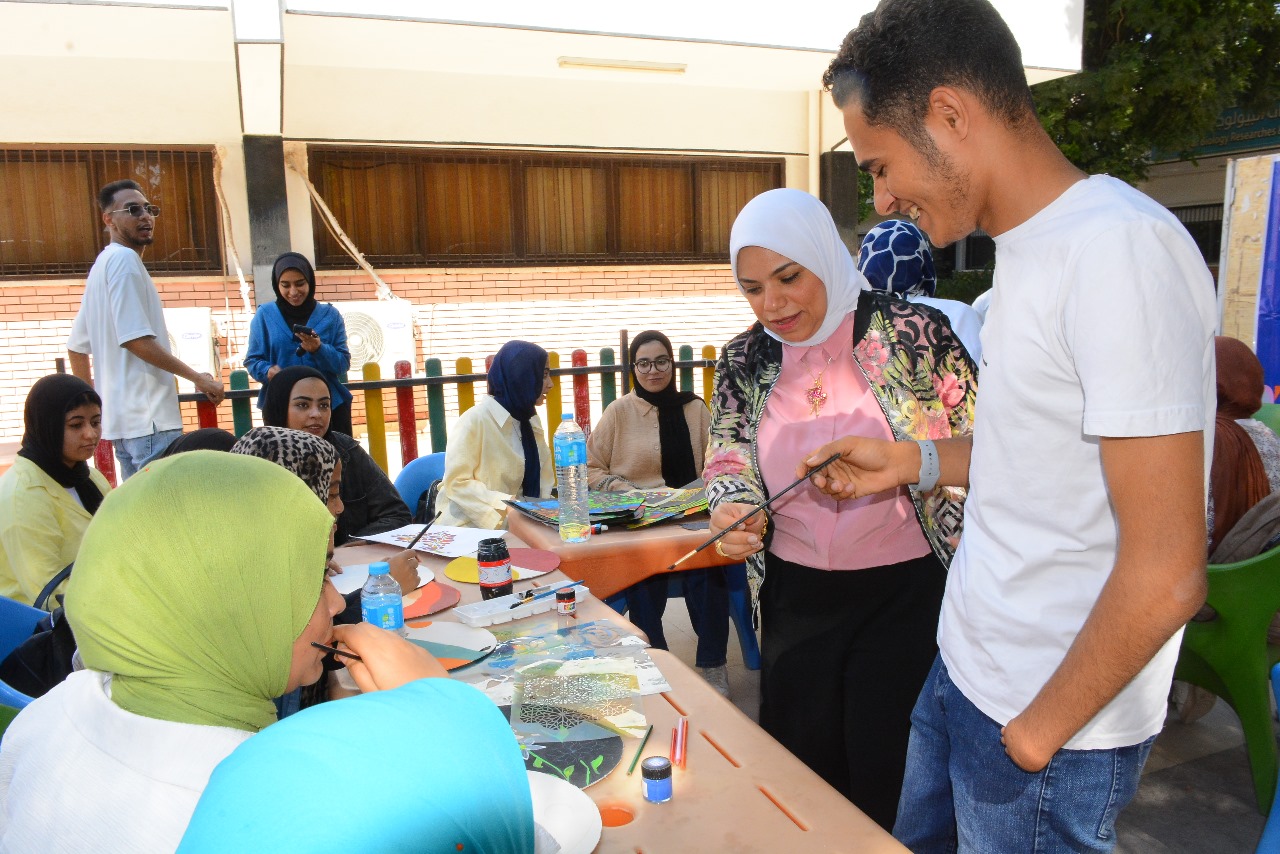 وأوضحت الدكتورة أمنية عبد القادر أن المبادرة تهدف إلى التوعية بحقوق الطلاب ذوي الإعاقة داخل المجتمع الجامعي، وتيسير كافة سبل الإتاحة والدمج، والتعريف بخدمات مركز رعاية الطلاب ذوي الإعاقة، وتنمية الوعي بثقافة الشمول والمساواة بين الطلاب وأعضاء هيئة التدريس والعاملين بالجامعة. وتم اليوم تنفيذ النشاط الفني "ريشة الدمج.. نرسم معًا لنثبت أن الإبداع لغة الجميع" بمشاركة 78 طالبًا وطالبة، منهم 43 من الطلاب ذوي الإعاقة و35 من زملائهم الأسوياء، حيث تعاونوا معًا في رسم لوحات مشتركة، إلى جانب إنتاج عدد من اللوحات الفردية التي عبّرت عن الأمل والتعاون والمساواة، وتضمنت مناظر طبيعية وتصاميم ابتكارية، باستخدام الطباعة على الخشب والورق بألوان الجواش، والاستنسل، والحفر على الألومنيوم، وأشغال فنية بورق الكانسون الملون.
