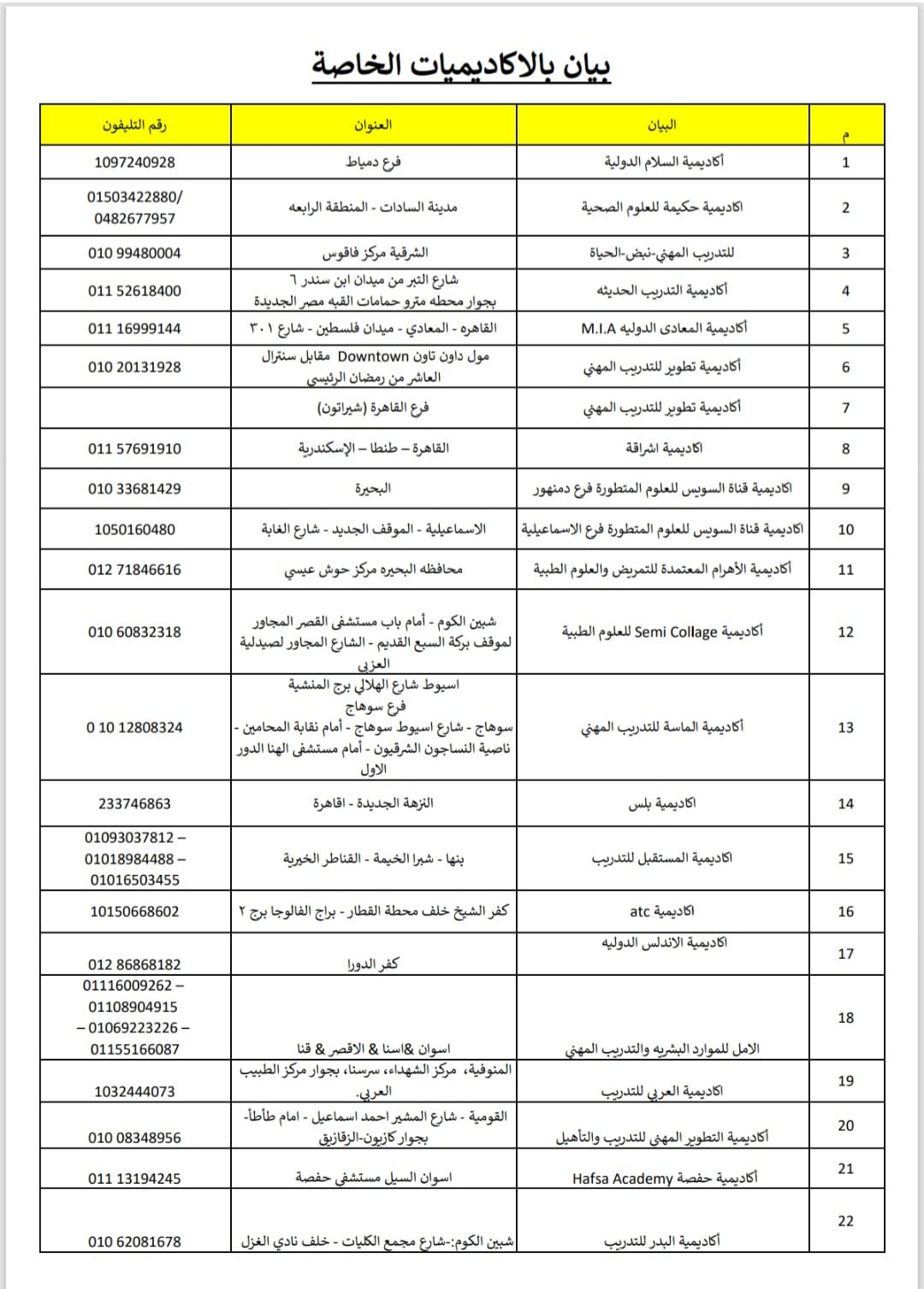 وأرفقت النقابة العامة للتمريض مع خطابها قائمة كاملة بالأكاديميات ومراكز التدريب التي تم رصدها باعتبارها كيانات وهمية وغير معتمدة، وعددها 22 أكاديمية ومركز تدريب، وهي..