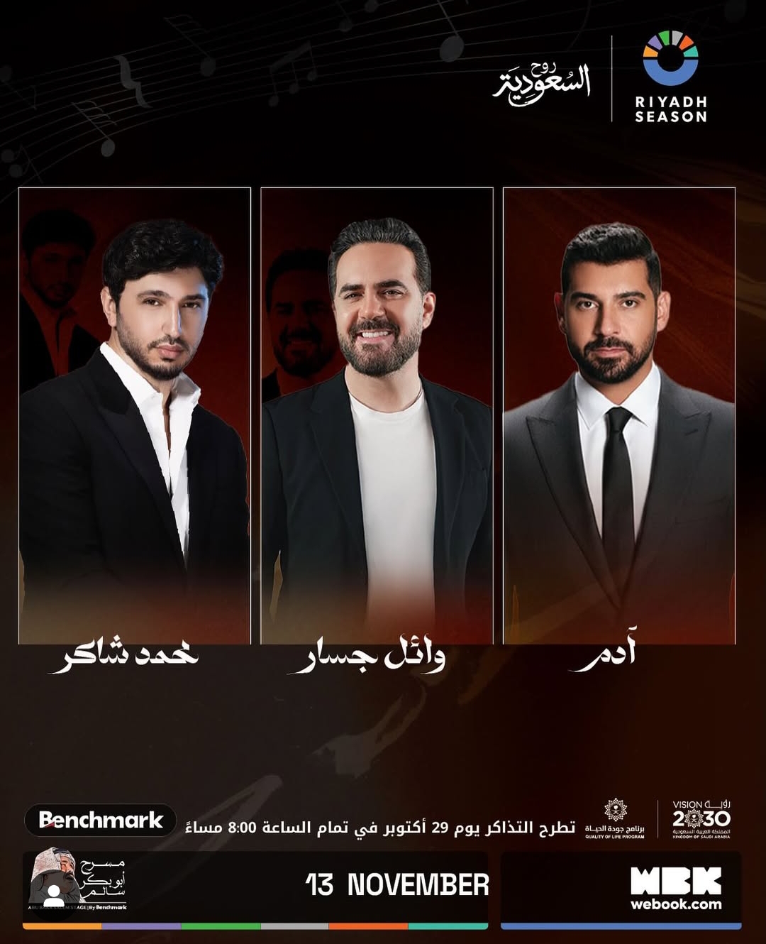 يستعد الفنان محمد فضل شاكر، لإحياء حفل غنائي مع الفنان وائل جسار، والفنان آدم، يوم 13 نوفمبر المقبل، ضمن سلسلة حفلات موسم الرياض بالمملكة العربية السعودية.