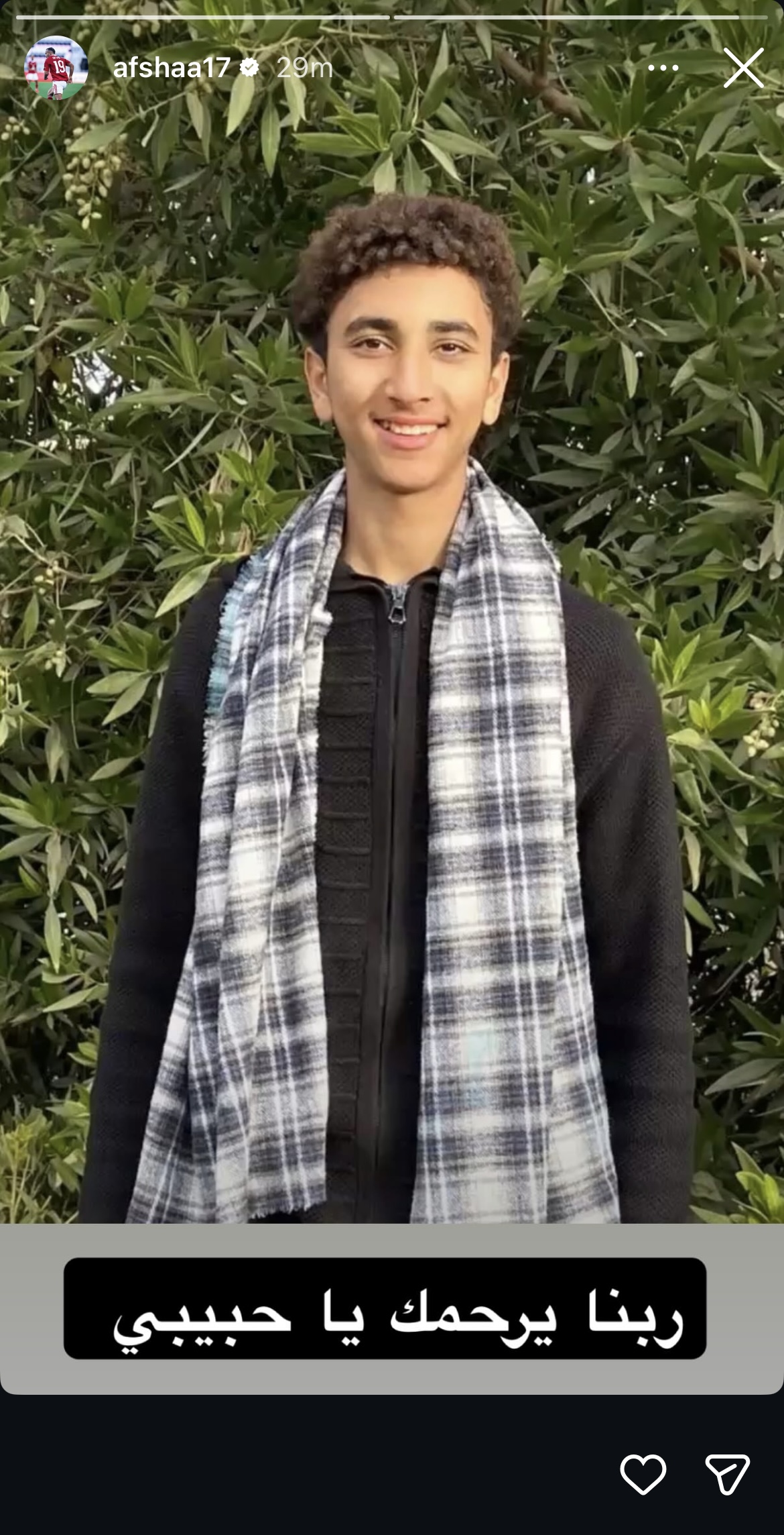 وكتب أفشة عبر استوري عبر حسابه على موقع التواصل الاجتماعي انستجرام :"اللهم أجرنا في مصيبتنا ابن عمتي في ذمة الله.. حادثة إنا لله وإنا اليه راجعون ".