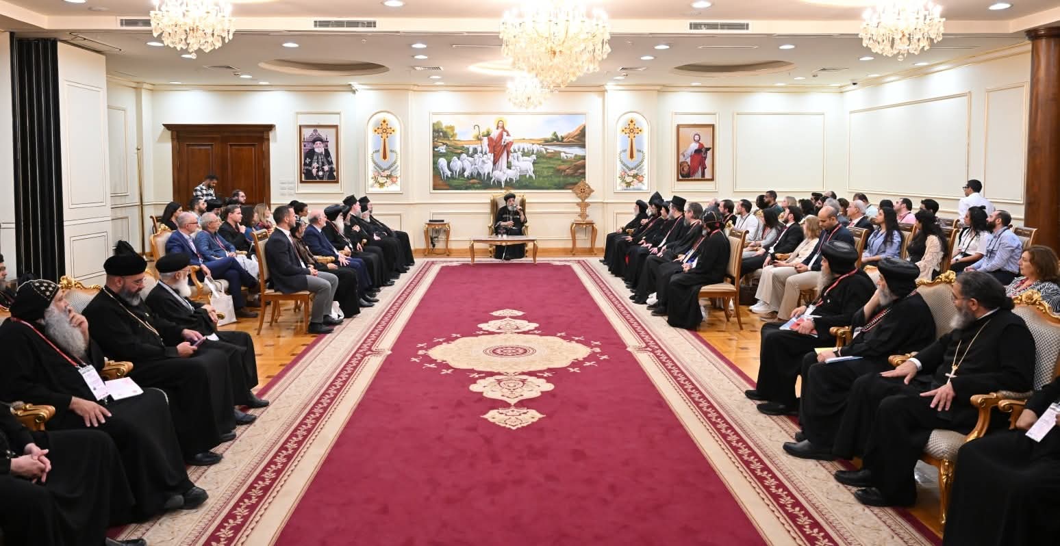 ورحب قداسة البابا بوفود الكنائس معربًا عن سعادته بزيارتهم لمصر ومشاركتهم في مؤتمر مجلس الكنائس العالمي، ثم حدثهم عن مصر وتميزها التاريخي والجغرافي والحضاري لافتًا إلى أن المصريين يعيشون معًا حول نهر النيل في وحدة وطنية طبيعية بفعل ما اكتسبوه من النهر الهادئ.