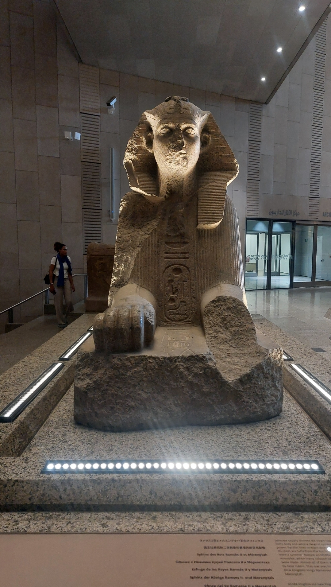 ويقع المتحف المصري الكبير على مساحة 490 ألف متر مربع،يضم أكثر من 57 ألف قطعة أثرية،ويوجد به 12 قاعة عرض رئيسية ،بالإضافة إلى متحف الطفل ومتحف الملك خوفو .