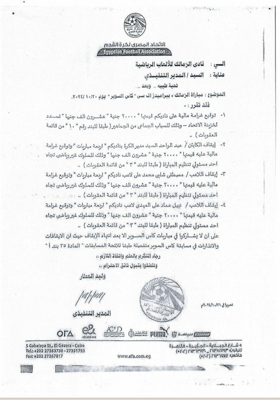وتضمنت طيات خطاب اتحاد الكرة مطالبة نادي الزمالك بالرجوع إلي البريد الإليكتروني لمراجعة وصول الإيميل الخاص بعقوبات ثلاثي القلعة البيضاء نبيل عماد دونجا وعبدالواحد السيد مدير الكرة السابق فى القلعة البيضاء ومصطفي شلبي لاعب الفارس الأبيض السابق عقب انتهاء مباراة بيراميدة فى النسخة الماضية من بطولة كاس السوبر المصري.