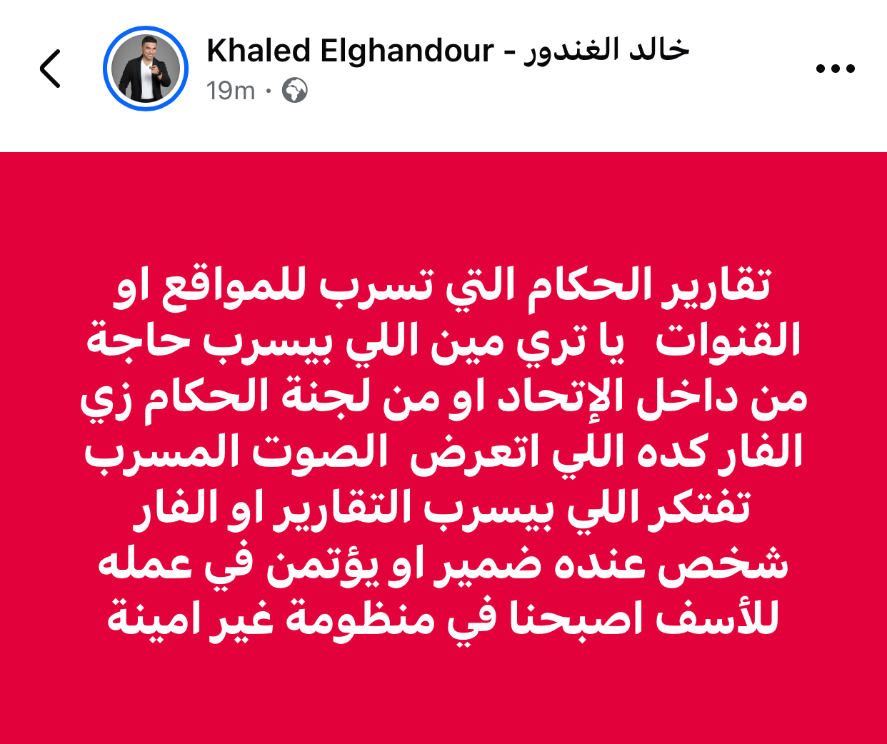 وكتب الغندور عبر حسابه الرسمي على موقع التواصل الاجتماعي فيسبوك: “تقارير الحكام التي تُسرب للمواقع أو القنوات.. يا ترى مين اللي بيسرب حاجة من لجنة الحكام؟ زي الفار كده اللي اتعرض الصوت المسرب. تفتكر اللي بيسرب التقارير أو الفار شخص عنده ضمير أو يؤتمن في عمله؟ للأسف أصبحنا في منظومة غير أمينة”.