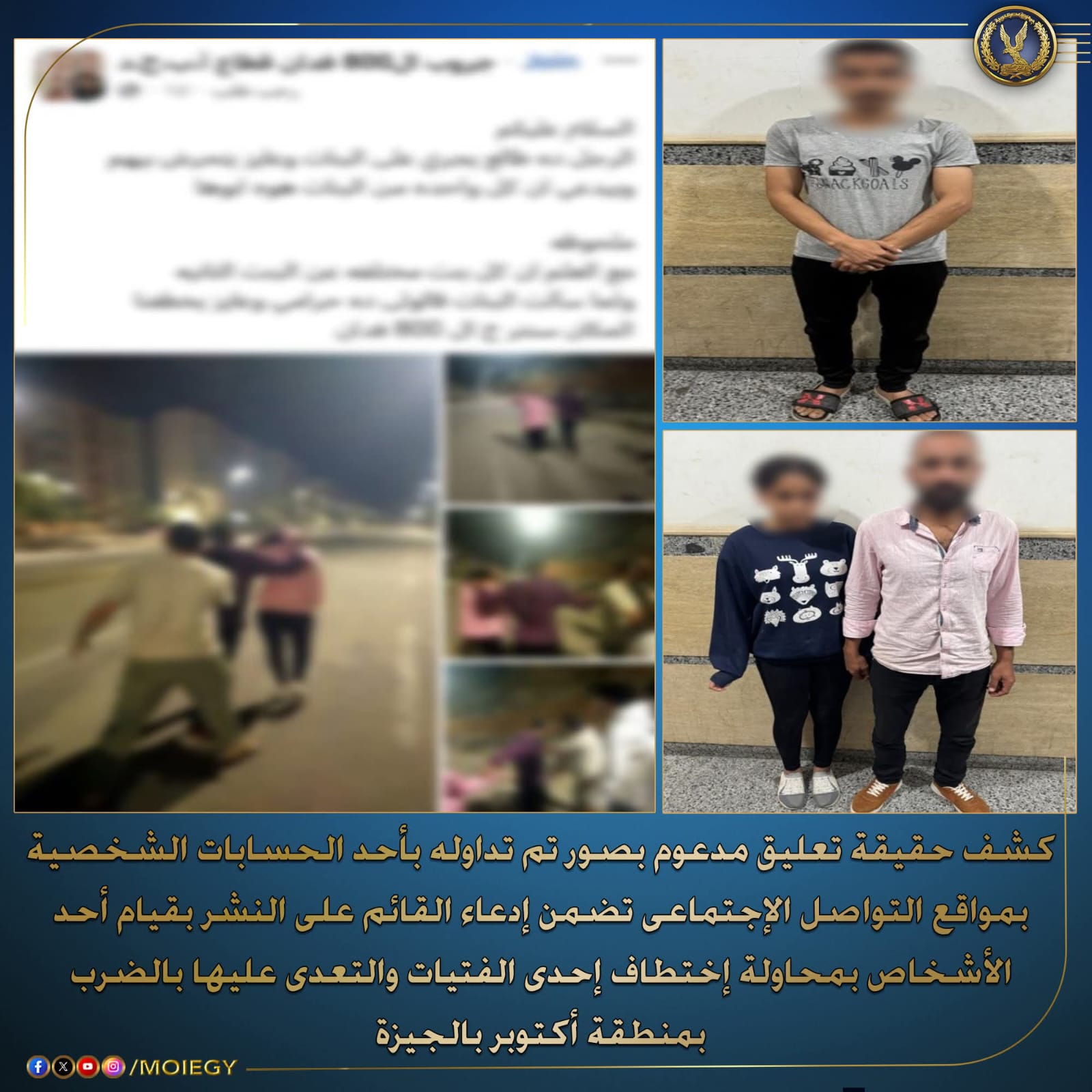 كشفت الأجهزة الأمنية حقيقة تعليق مدعوم بصور تم تداوله بأحد الحسابات الشخصية بمواقع التواصل الاجتماعى تضمن إدعاء القائم على النشر بقيام أحد الأشخاص بمحاولة اختطاف إحدى الفتيات والتعدى عليها بالضرب بمنطقة أكتوبر بالجيزة.