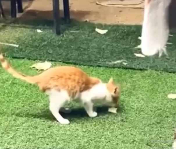 قطة بائسة تمشي في الشوارع للبحث عن لقمة صغيرة أو أن تجد من يعطف عليها ببعض فضلات الطعام، وكان صوت القطة يصرخ من شدة الجوع، ما لفت نظر مجموعة من الشباب داخل مطعم، الذين قرروا اللعب بتلك الروح.