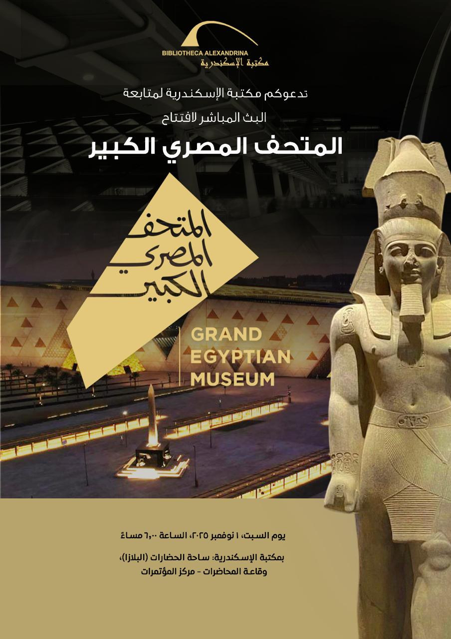 في إطار الاستعدادات الوطنية لافتتاح المتحف المصري الكبير يوم السبت المقبل، الموافق 1 نوفمبر 2025، تحتفل مكتبة الإسكندرية بهذا الحدث التاريخي الكبير والفريد مع روادها من جمهور الإسكندرية، عبر إطلاق بث مباشر لفاعليات الافتتاح من ساحة الحضارات (البلازا) وقاعة المحاضرات بمكتبة الإسكندرية، وذلك يوم السبت في تمام الساعة السادسة مساءً، انطلاقاً من رسالتها التنويرية كونها نافذة مصر على العالم ونافذة العالم على مصر.