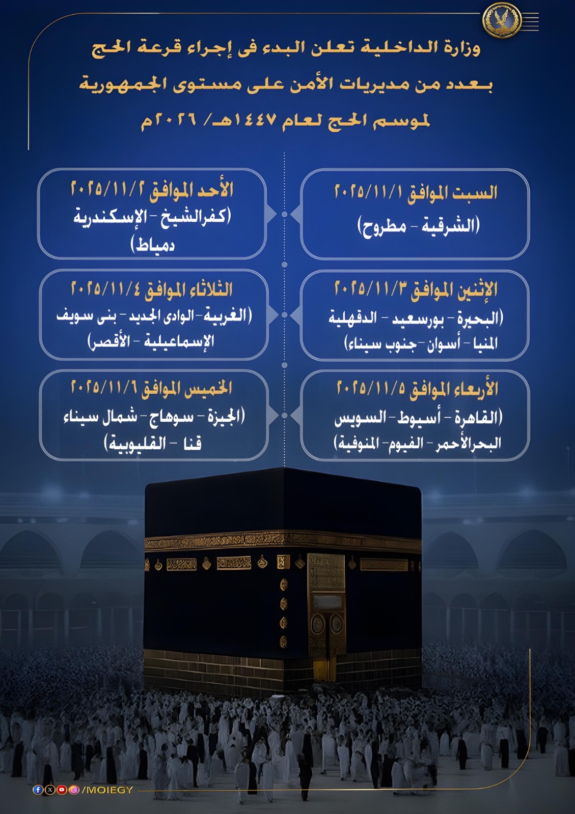 أعلنت وزارة الداخلية البدء فى إجراء قرعة الحج بمديريات الأمن على مستوى الجمهورية فى إطار تفعيل الإجراءات التنفيذية لتنظيم قرعة الحج هذا العام 1447هـ/2026م ، وذلك خلال الفترة من يوم السبت الموافق 1/11/2025 وحتى يوم الخميس الموافق 6/11/2025.