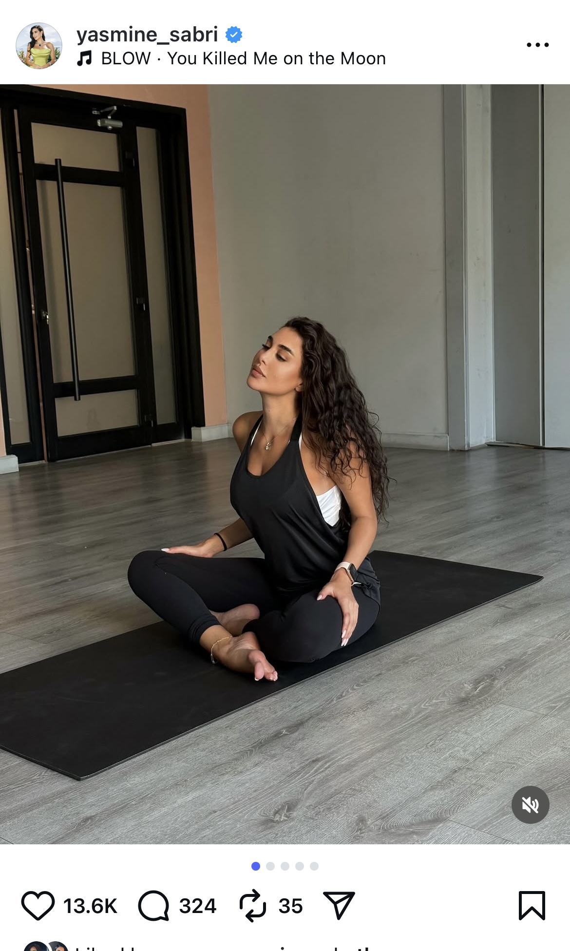 وظهرت ياسمين صبري ، وهي تؤدي رياضة اليوجا بملابس رياضية،مما حازت الصورة علي اعجاب متابعيها.