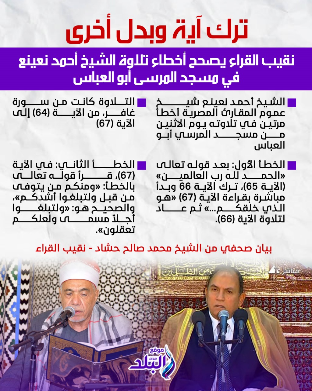 وتابع: أما الخطأ الثاني الآية رقم 67 قرأ قوله تعالى بالخطأ (ومنكم من يتوفى من قبل ولتبلغوا أشدكم) والصحيح (ولتبلغوا أجلا مسمىً ولعلكم تعقلون).