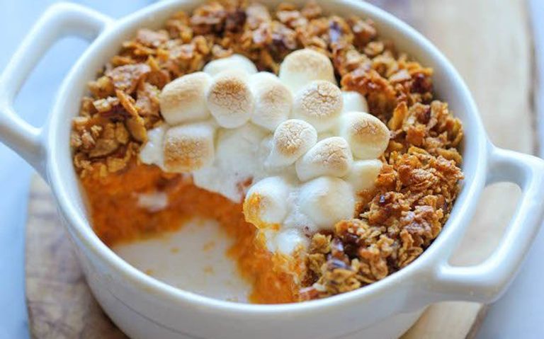 - أضيفي ما تبقّى من البطاطا، وزيّني الوجه بالمكسرات.