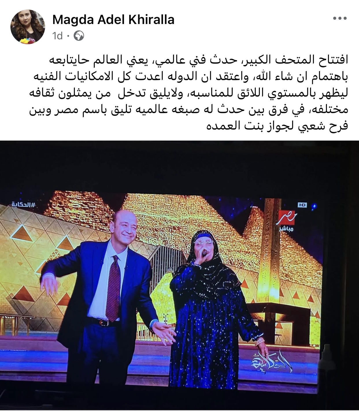 وكتبت خير الله على حسابها الشخصي بموقع فيسبوك: "افتتاح المتحف الكبير، حدث فني عالمي، يعني العالم حايتابعه باهتمام ان شاء الله، واعتقد ان الدوله اعدت كل الامكانيات الفنيه ليظهر بالمستوي اللائق للمناسبه، ولايليق تدخل من يمثلون ثقافه مختلفه، في فرق بين حدث له صبغه عالميه تليق باسم مصر وبين فرح شعبي لجواز بنت العمدة".