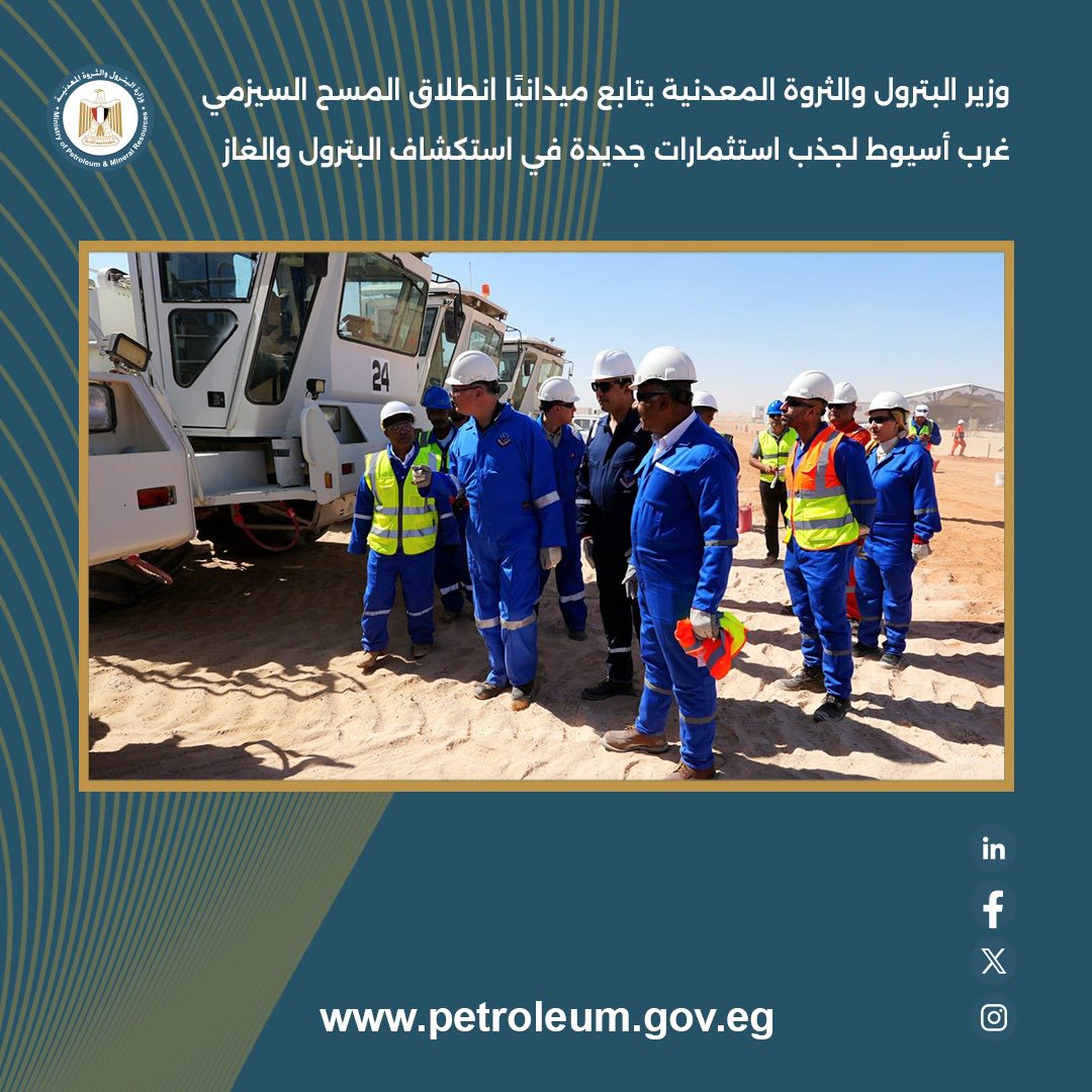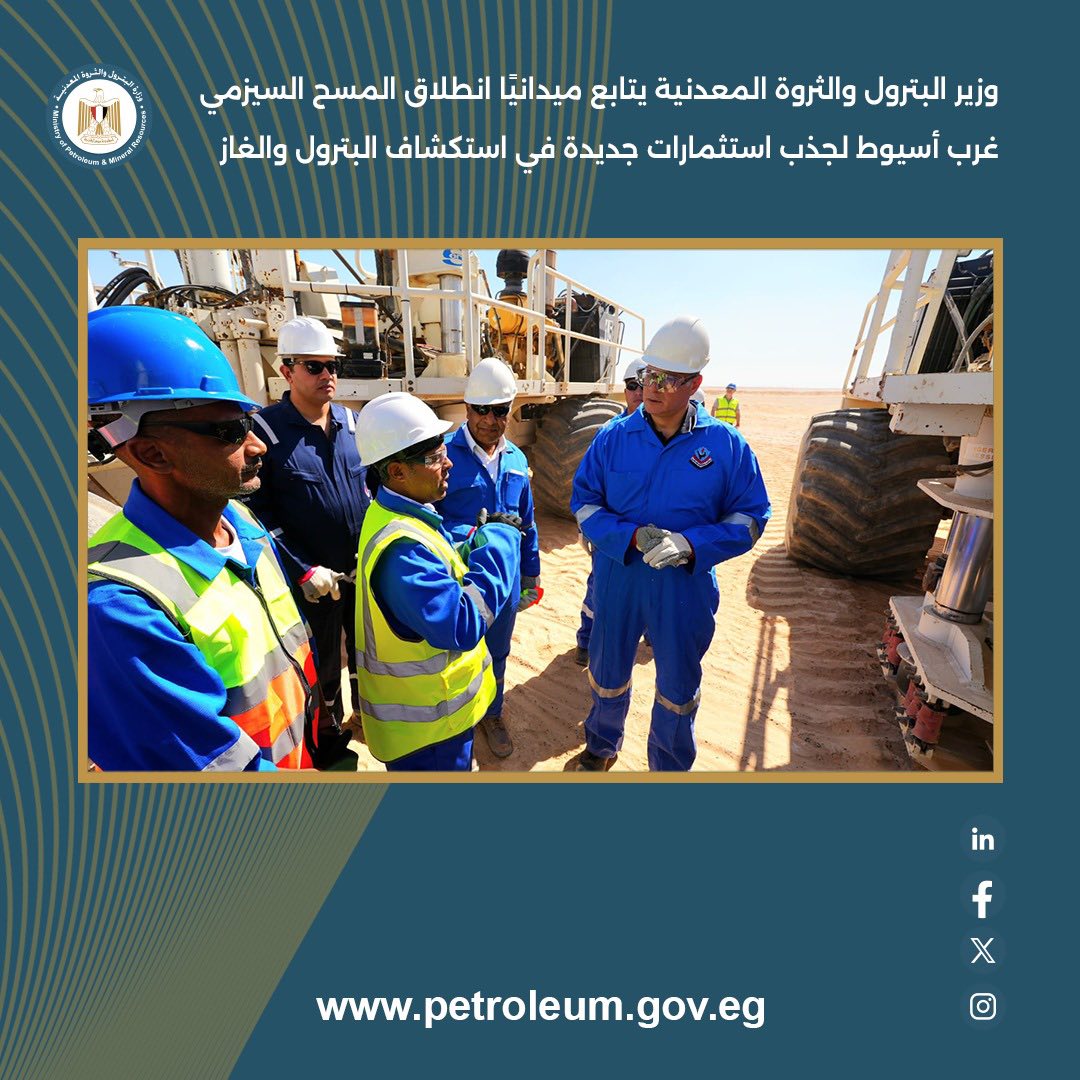 تفقد المهندس كريم بدوي وزير البترول والثروة المعدنية، يرافقه قيادات الوزارة إنطلاق اعمال المسح السيزمي جنوب الصحراء الغربية بمنطقة غرب أسيوط.