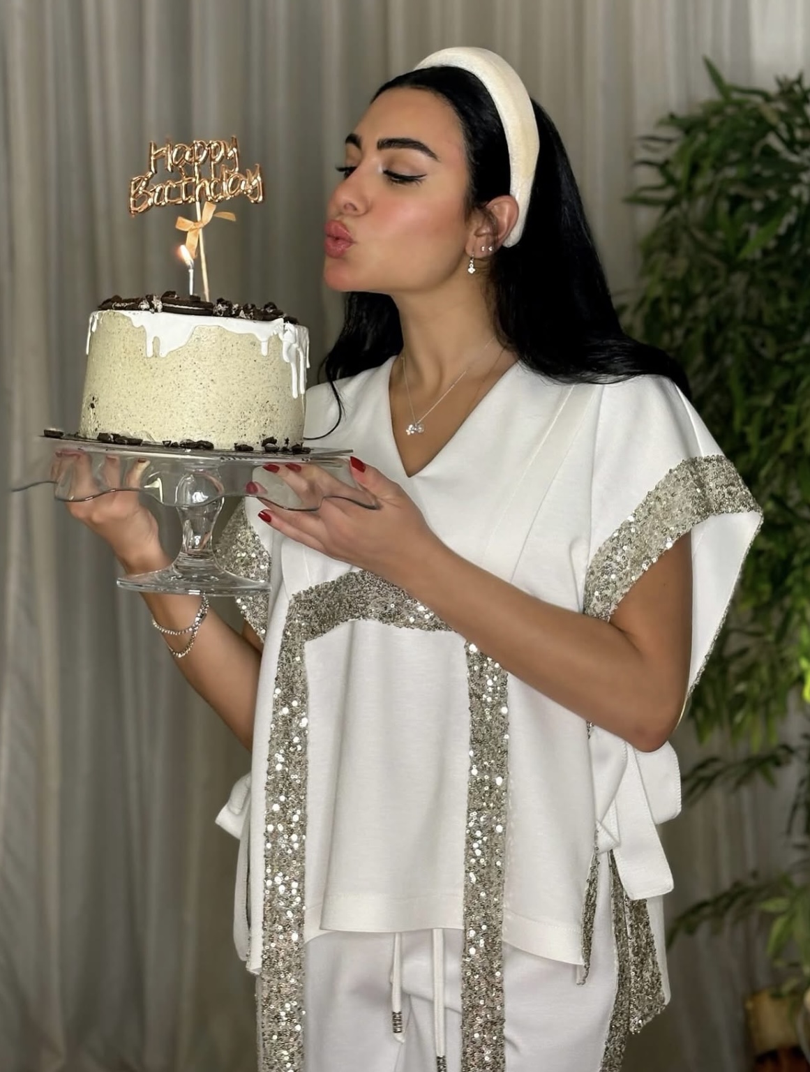 وظهرت ميريهان مرتدية سوت بيضاء بها بعض الأجزاء اللامعة باللون الفضي، مع ربطة شعر باللون الأبيض.