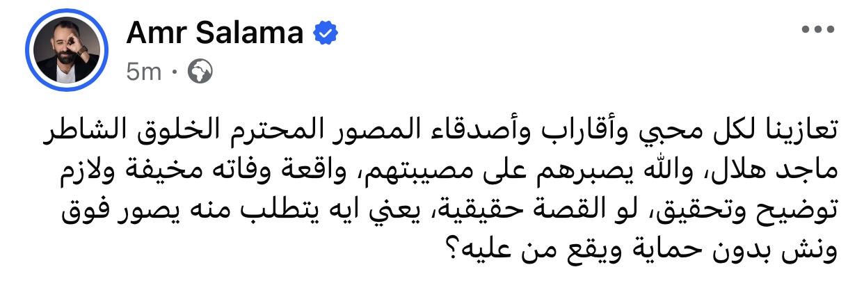 نعى المخرج عمرو سلامة المصور الراحل ماجد هلال عبر حسابه الشخصي بموقع التواصل الإجتماعي فيسبوك، معبرًا عن حزنه الشديد وصدمته من خبر الوفاة، ومطالبًا بضرورة توضيح أسباب الحادث الذي وصفه بـ”المخيف”.