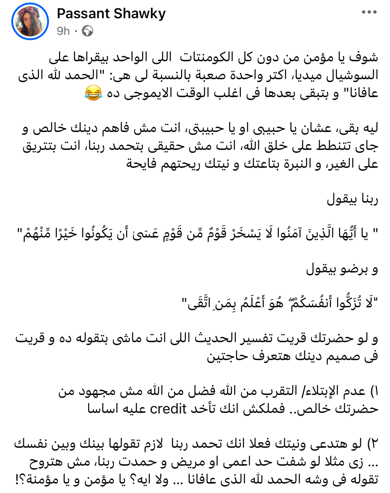وتابعت: "ليه بقى؟ عشان يا حبيبي أو يا حبيبتي، انت مش فاهم دينك خالص وجاي تتنطط على خلق الله، انت مش حقيقي بتحمد ربنا، انت بتتريق على الغير، والنبرة بتاعتك ونيتك ريحتهم فايحة.”