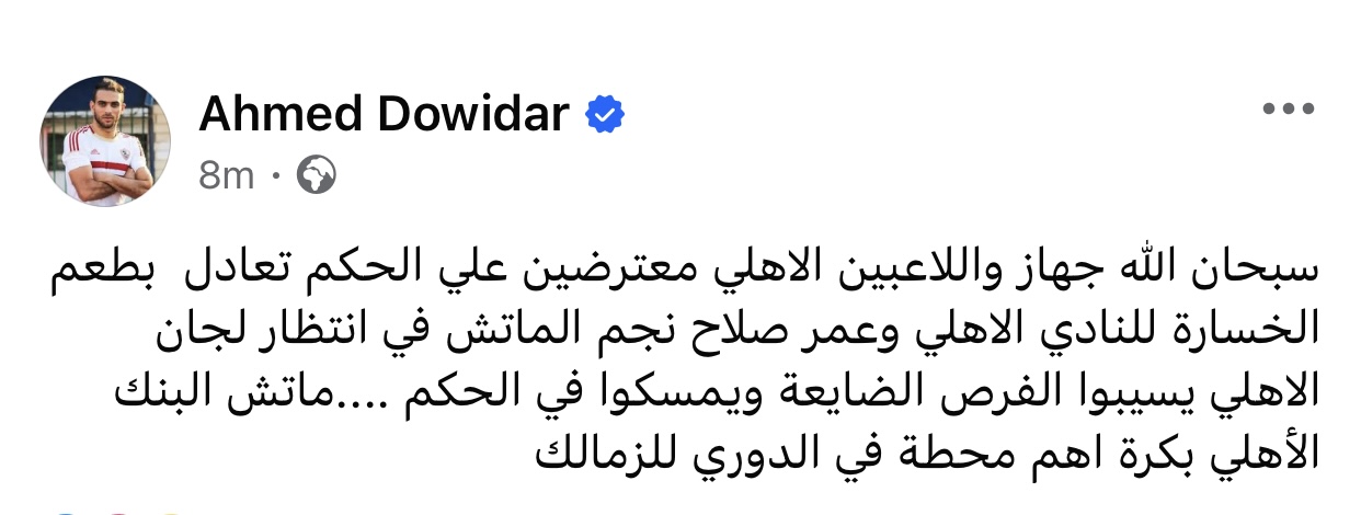 وكتب دويدار عبر حسابه الشخصي على موقع التواصل الاجتماعي فيسبوك: “سبحان الله، الجهاز ولاعبية الأهلي معترضين على الحكم، تعادل بطعم الخسارة للنادي الأهلي، وعمر صلاح نجم الماتش، في انتظار لجان الأهلي يسيبوا الفرص الضايعة ويمسكوا في الحكم.