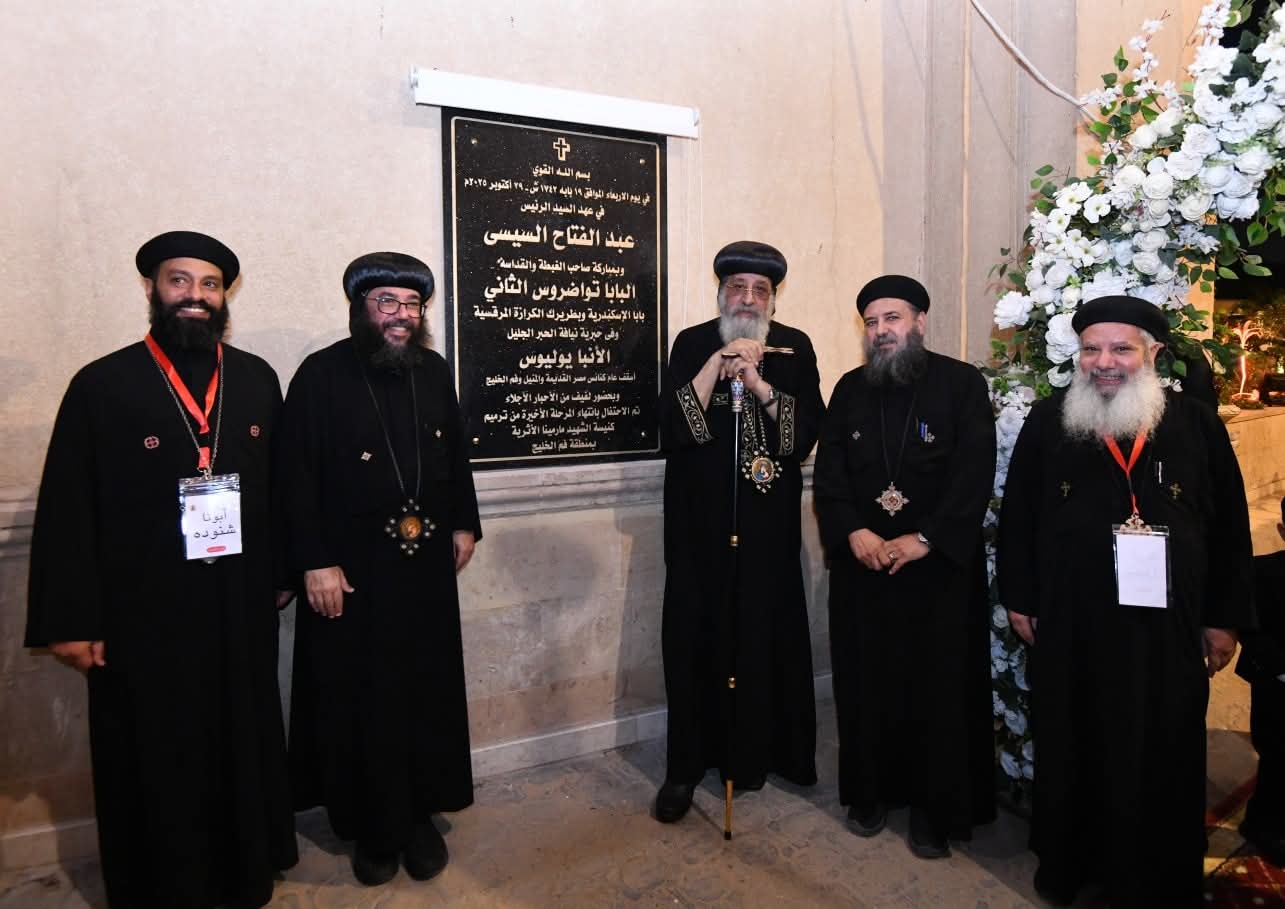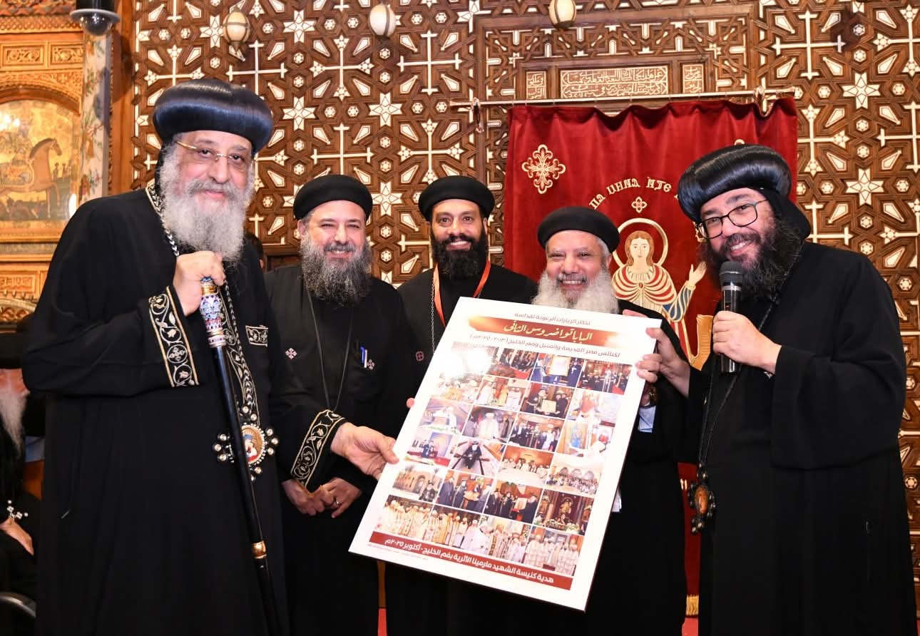 وصلى قداسته صلوات العشية بمشاركة نيافة الأنبا يوليوس الأسقف العام لمصر القديمة وأسقفية الخدمات، وعدد من أحبار الكنيسة وعقب العشية رتل خورس الشمامسة وكورال الكنيسة عددًا من الألحان الكنسية وشجعهم قداسة البابا، ثم تحدث نيافة الأنبا يوليوس مُرًحبًا بقداسة البابا وعرض لتاريخ الكنيسة التي يرجع تاسيسها للقرن الخامس الميلادي، وتم تكريم الحاصلين على شهادات الدكتوراه والماچستير من أبناء الكنيسة.
