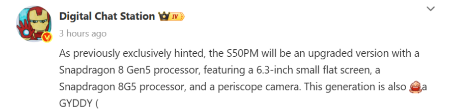 وتشير التقارير أيضًا إلى أن OnePlus Ace 6 Turbo سيكون أول هاتف ذكي في الصين يظهر لأول مرة بمعالج Snapdragon 8 Gen 5، مما يشير إلى أن S50 Pro Mini يمكن إطلاقه بعد فترة وجيزة منه.
