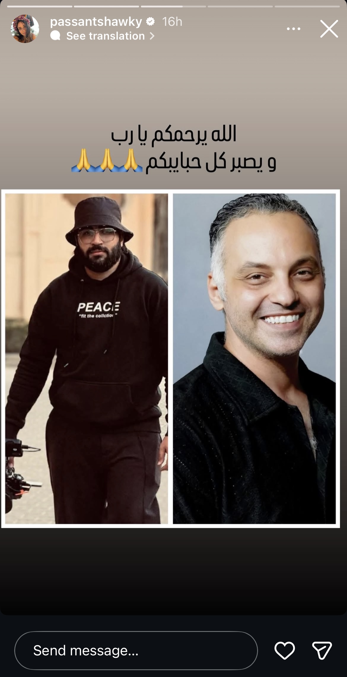 وكتبت بسنت شوقي عبر ستوري حسابها على انستجرام: “البقاء لله ربنا يصبر كل حبايبكم”.