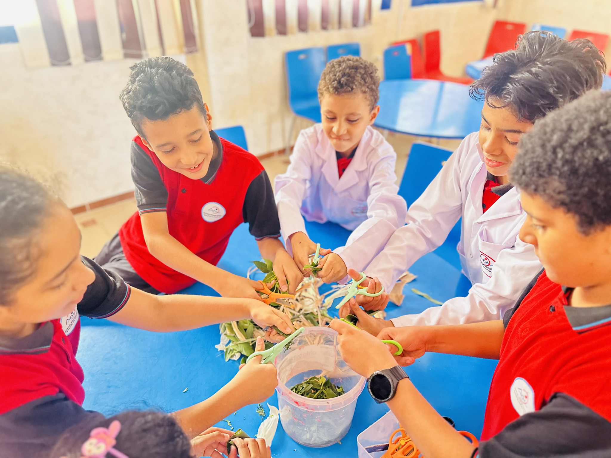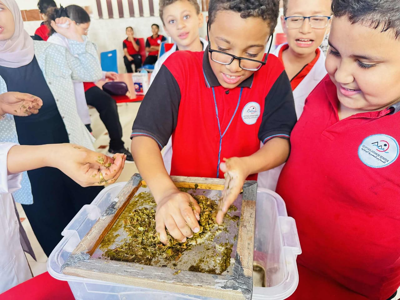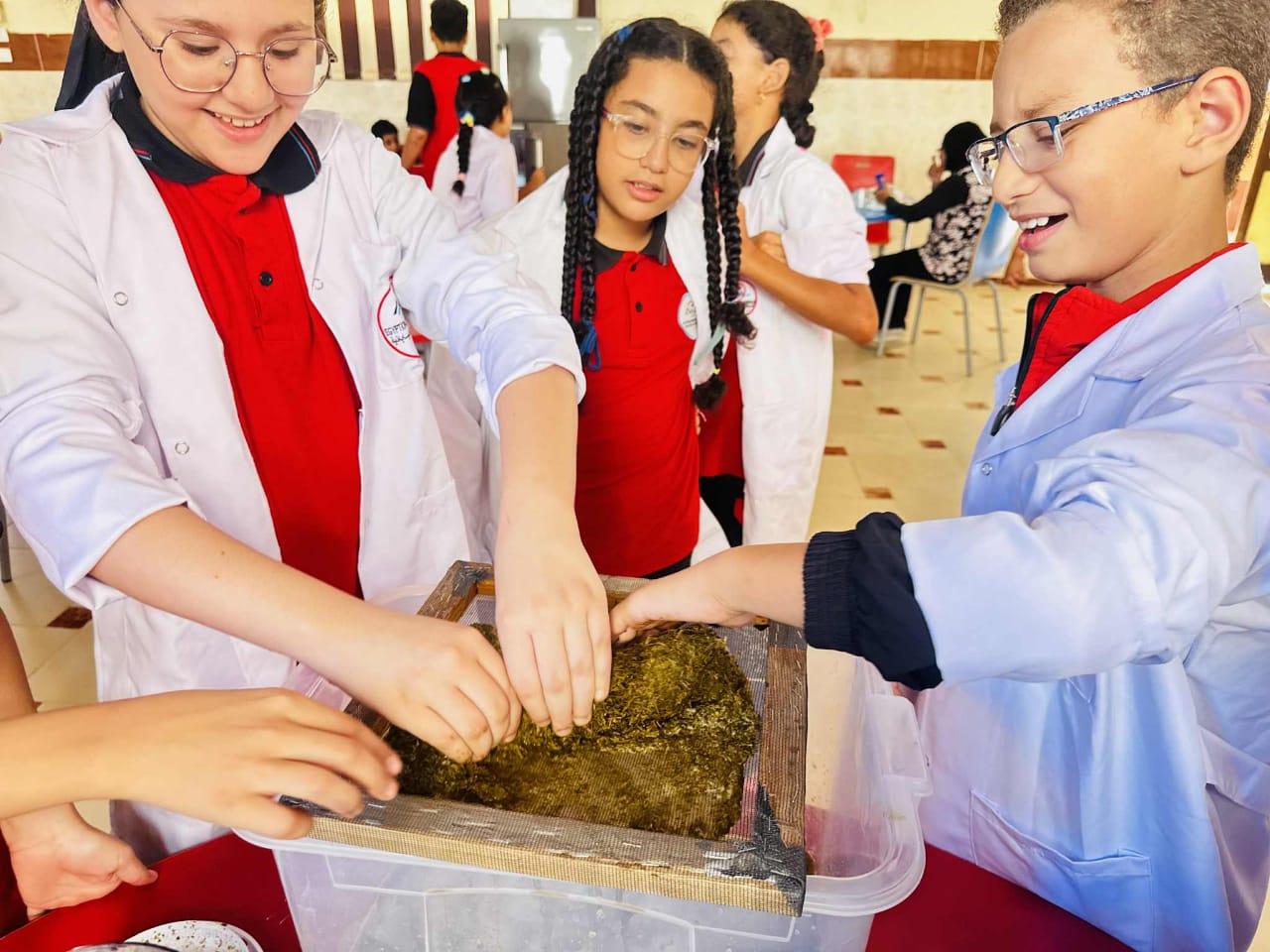 جاءت هذه التجربة العلمية المتميزة لطلاب الصف الخامس الابتدائي ضمن حصص مادة العلوم، حيث استخدموا أوراق الشجر الخضراء كبديل لنبات البردي الأصلي.
