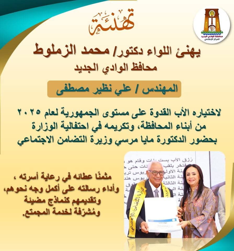 وأضاف أنه تم اختياره الاب القدوه من أبناء الوادي الجديد لعام ٢٠٢٥ وتم تكريمه في احتفالية الوزاره بحضور الدكتوره مايا مرسي وزيرة التضامن الاجتماعي.