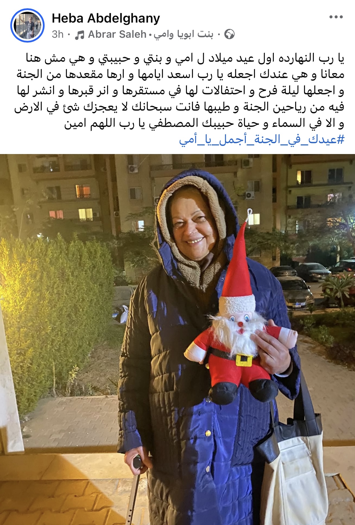 وكتبت هبة عبدالغني عبر حسابها الشخصي بموقع فيسبوك: “يا رب النهارده اول عيد ميلاد ل امي و بنتي و حبيبتي و هي مش هنا معانا وهي عندك اجعله يا رب اسعد ايامها وارها مقعدها من الجنة واجعلها ليلة فرح و احتفالات لها في مستقرها وانر قبرها و انشر لها فيه من رياحين الجنة وطيبها فانت سبحانك لا يعجزك شئ في الارض والا في السماء وحياة حبيبك المصطفي يا رب اللهم امين”.