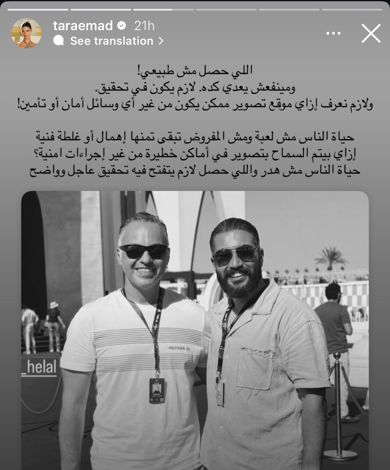 وكتب تارا عماد على حسابها الشخصي بموقع إنستجرام: "اللي حصل مش طبيعي! ومينفعش يعدي كده. لازم يكون في تحقيق، ولازم نعرف إزاي موقع تصوير ممكن يكون من غير أي وسائل أمان أو تأمين!