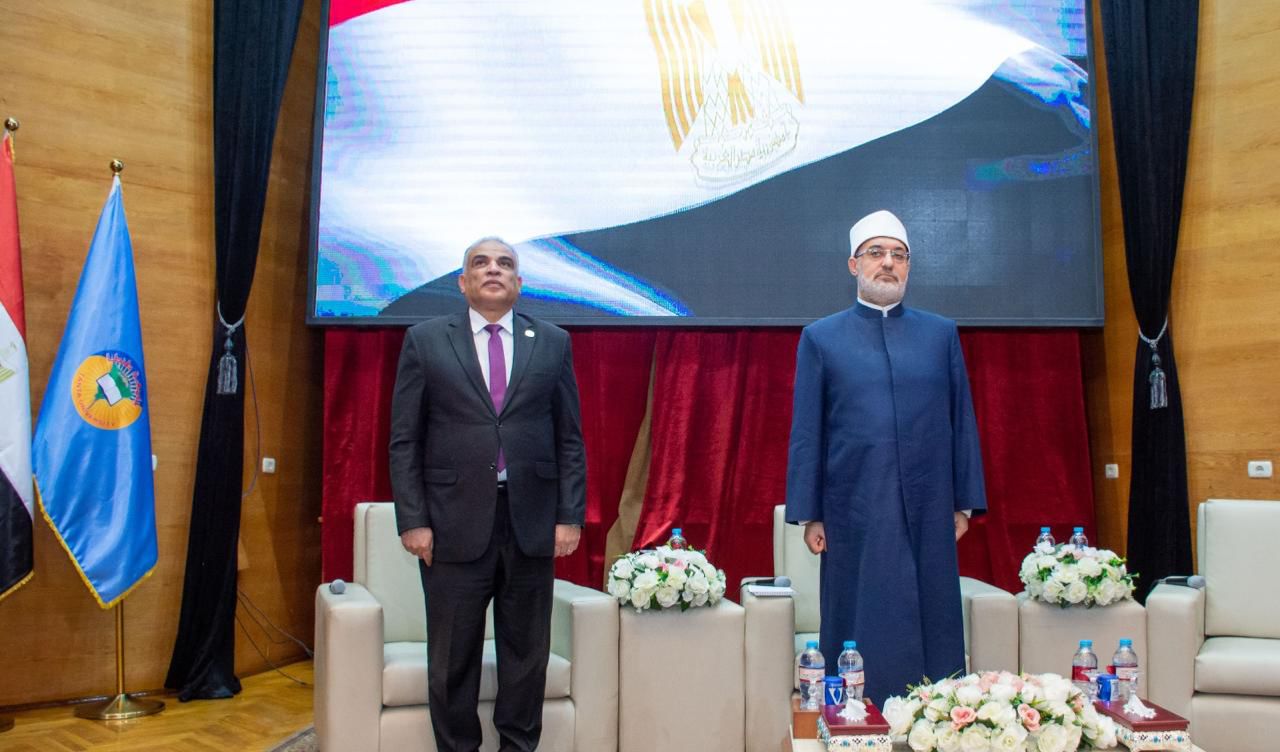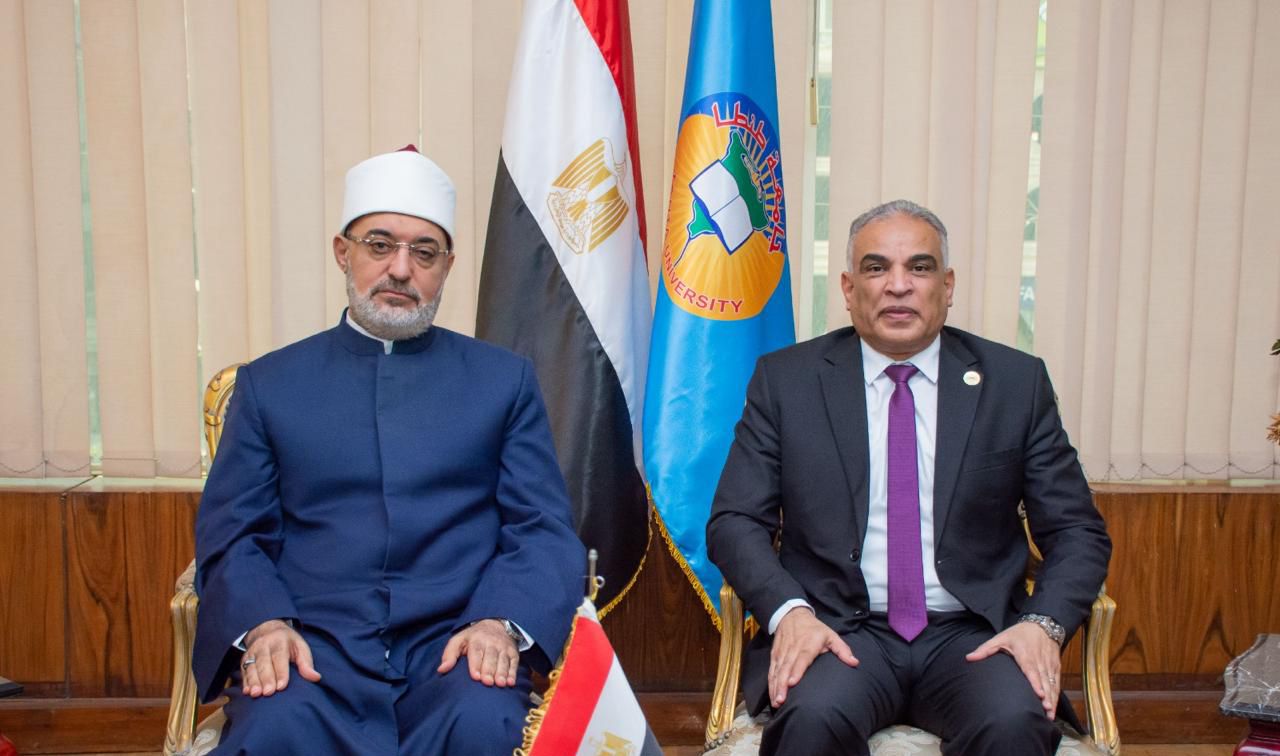 وفي لفتة تقدير قام الدكتور محمد حسين بتقديم درع الجامعة لفضيلة المفتي، تقديرًا لجهوده البارزة في رفع مستوى الوعي لدى الشباب ونشر الفكر الوسطي المستنير، وإسهاماته العلمية والدعوية في ترسيخ قيم الانتماء والمسؤولية وتعزيز التواصل بين المؤسسات الدينية والعلمية.