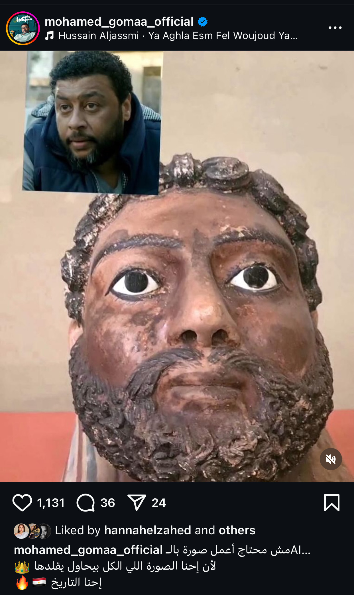 ونشر جمعة الصورة على حسابه الشخصي بموقع إنستجرام وعلق عليها قائلاً: "مش محتاج أعمل صورة بال AI، لأن إحنا الصورة اللي الكل بيحاول يقلدها، إحنا التاريخ".