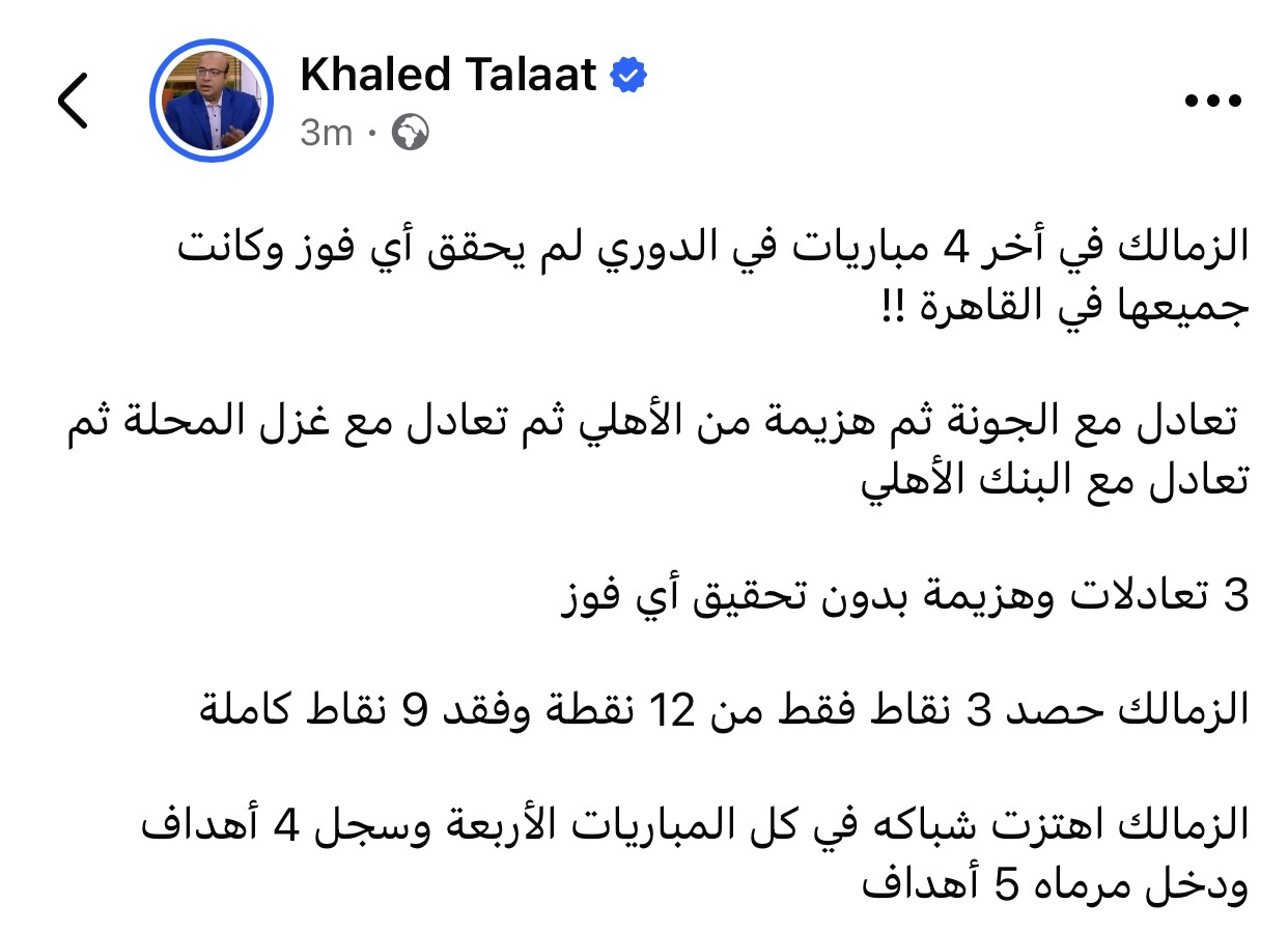 ونشر خالد طلعت عبر حسابه الشخصي على موقع فيسبوك منشورًا قال فيه: “الزمالك في آخر 4 مباريات في الدوري لم يحقق أي فوز وكانت جميعها في القاهرة".