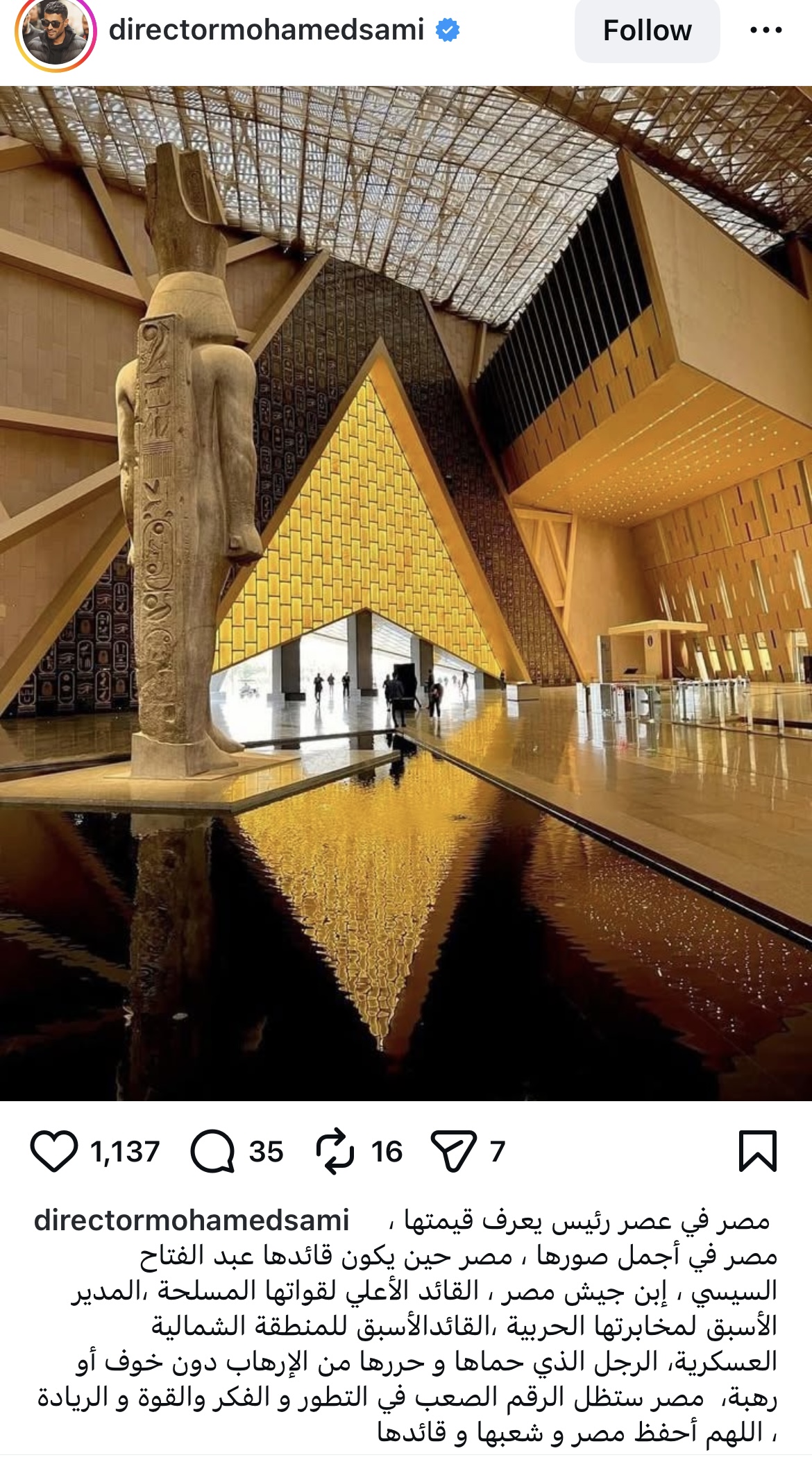 وكتب محمد سامي عبر حسابه الرسمي على موقع انستجرام: “مصر في عصر رئيس يعرف قيمتها، مصر في أجمل صورها، مصر حين يكون قائدها عبدالفتاح السيسي، ابن جيش مصر، القائد الأعلى لقواتها المسلحة، المدير الأسبق لمخابراتها الحربية، القائد الأسبق للمنطقة الشمالية العسكرية”.
