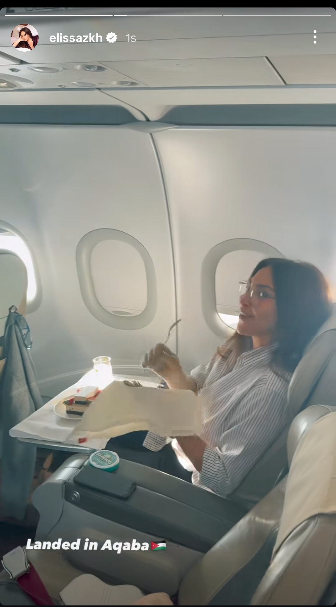 نشرت الفنانة اللبنانية إليسا، مقطع فيديو عبر ستوري حسابها الرسمي بتطبيق انستجرام، ظهرت فيه داخل الطائرة أثناء توجهها إلى مدينة العقبة في الأردن استعدادا لحفلها هناك.