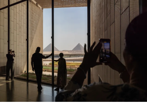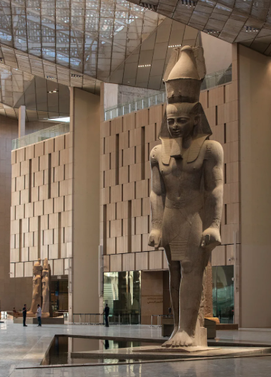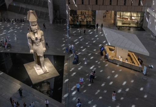 وأضافت أن تجربة زيارة المتحف المصري الكبير تبدأ في بهو شاهق، حيث يقف تمثال رمسيس الثاني، الذي يبلغ ارتفاعه 36 قدمًا، مُهيبًا وتمتد الزخارف الهرمية الزوايا المُستخدمة في واجهة المبنى - المُعبّر عنها بالخرسانة والزجاج والحجر الجيري المُستخرج محليًا - إلى هذه الساحة الداخلية الفخمة.