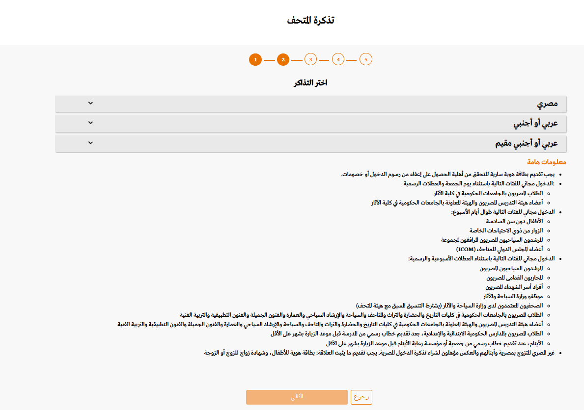 - بالنقر على زر التالي، ستظهر لك الفئات المخصص لتذاكر المتحف المصري الكبير.