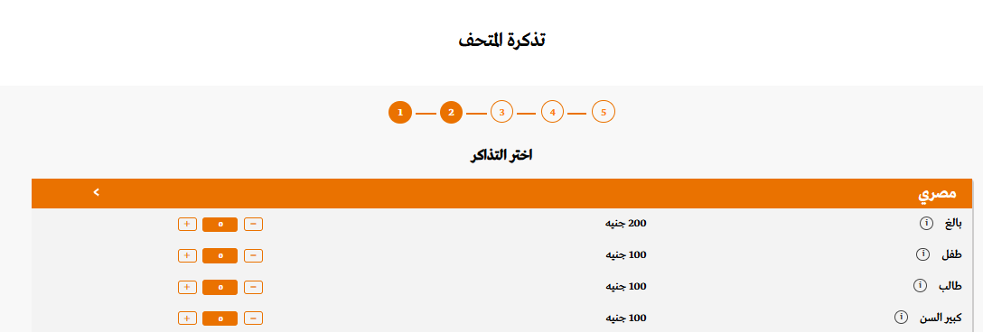 - النقر على خيار مصري، ستظهر لك فئات وأسعار التذاكر قم بتحديد عدد التذاكر المراد حجزها.