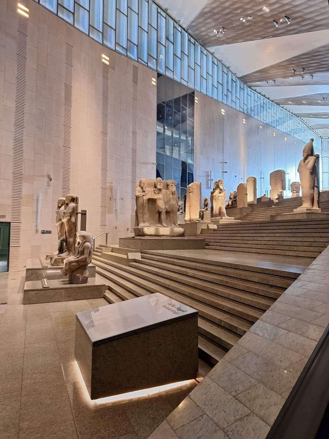 والأهم هو النافذة الضخمة في الطابق العلوي التي توفر إطلالة رائعة ومباشرة على أهرامات الجيزة، لربط التجربة المتحفية بالمعلم الأصلي للحضارة.
