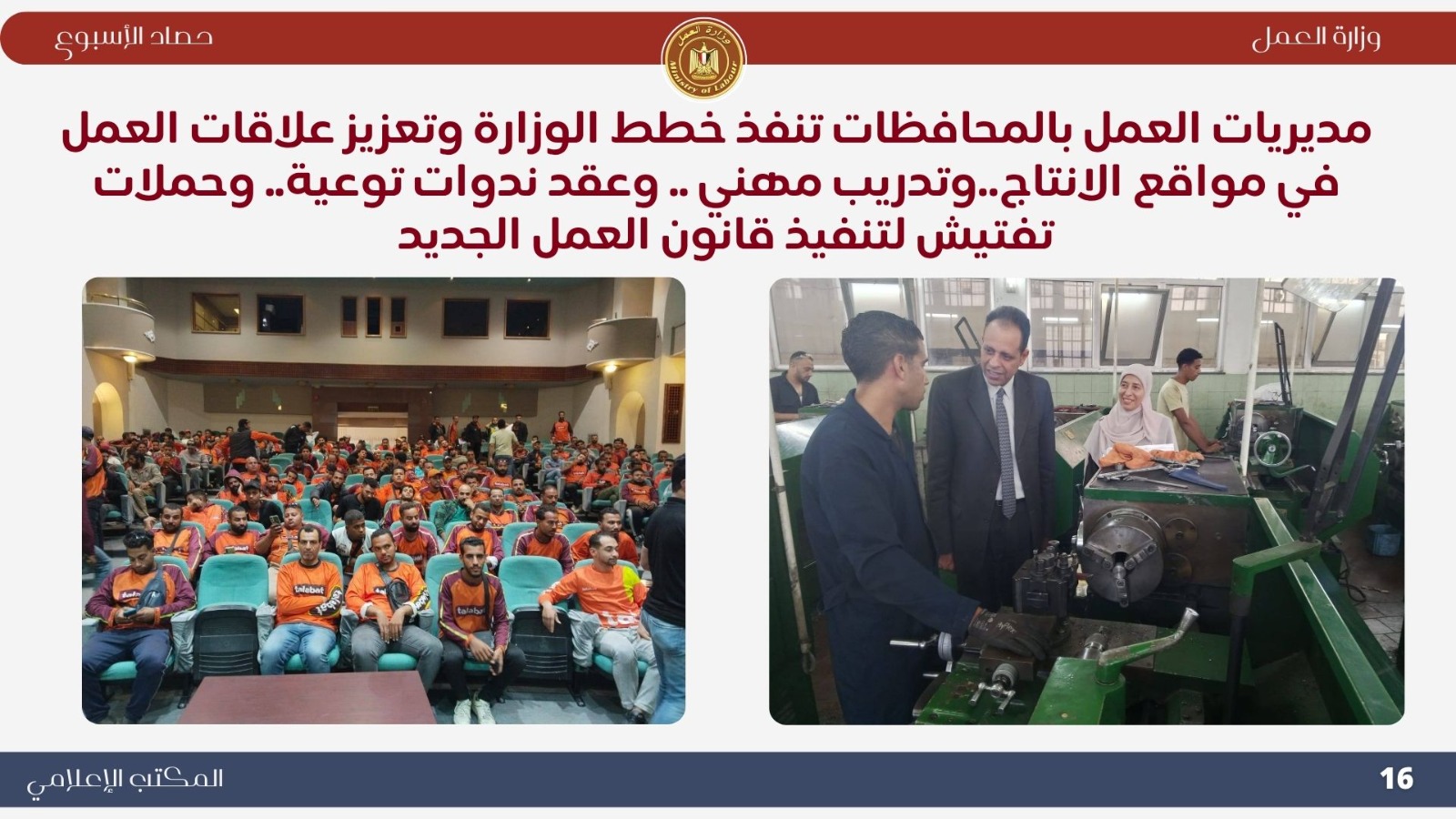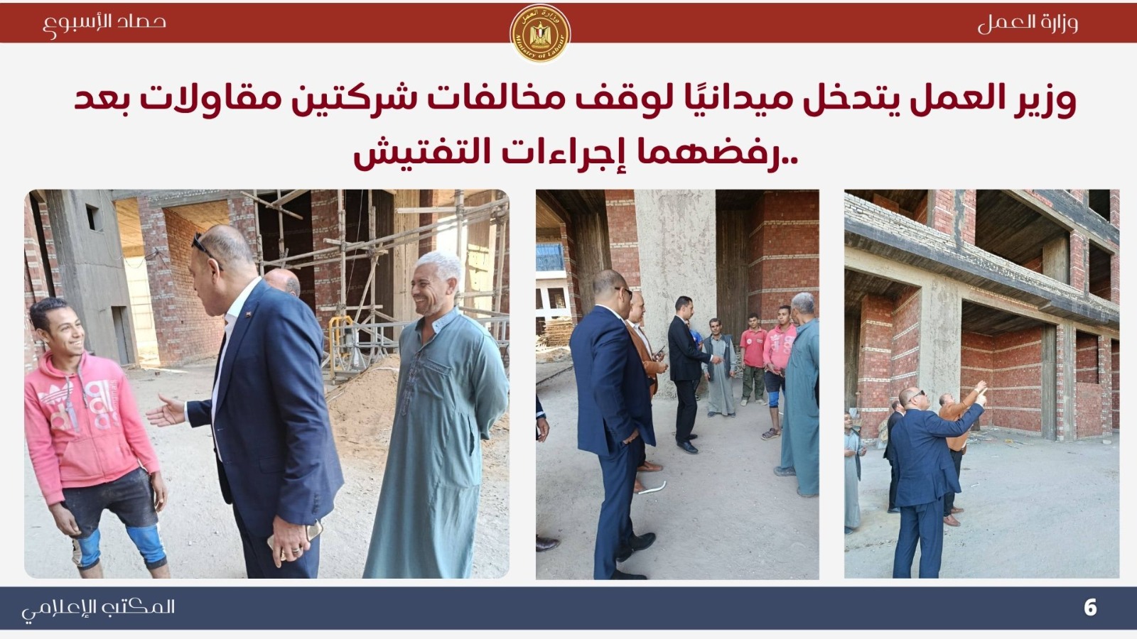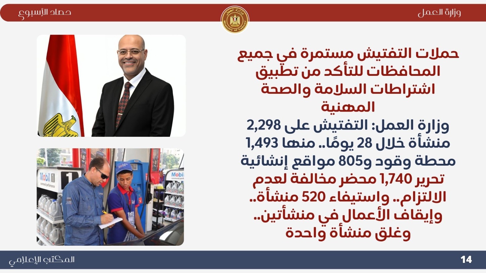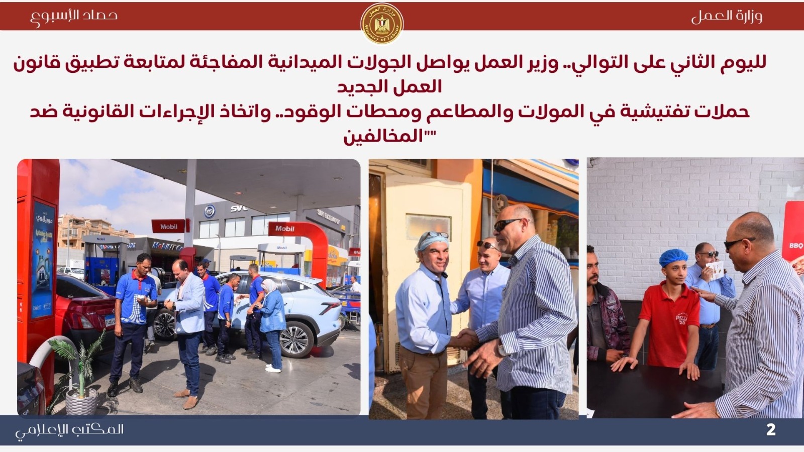*تعاون خارجي موسع اجتماع وزيري الخارجية والعمل لإنشاء قاعدة بيانات للعمالة المصرية بالخارج..حيث ناقش الوزيران بدر عبد العاطي ومحمد جبران بعض الملفات التي تخص العمالة المصرية بالخارج . *حملات تفتيش ميدانية مكثفة أعلنت اللجنة المركزية للتفتيش بوزارة العمل عن نتائج حملاتها خلال أسبوع واحد، حيث تم التفتيش على 721 منشأة، وتحرير 338 محضر مخالفة، ومنح مهلة لـ 390 منشأة لتصويب الأوضاع. وأكد الوزير جبران استمرار الحملات الميدانية لتطبيق قانون العمل الجديد رقم 14 لسنة 2025 وضمان العدالة في الأجور وصون حقوق العمال. *جولات ميدانية بالعاشر من رمضان تفتيش 100 منشأة وتحرير 138 محضرًا مخالفًا ..حيث قاد الوزير محمد جبران حملة تفتيش موسعة داخل المنطقة الصناعية بالعاشر من رمضان شملت 100 منشأة، أسفرت عن 67 مخالفة للحد الأدنى للأجور و71 مخالفة لتصاريح الأجانب، مع منح مهلة لتوفيق أوضاع 76 منشأة. وأكد أن الوزارة تتبع نهجًا يجمع بين الرقابة الصارمة والتوعية لتحقيق بيئة عمل عادلة وآمنة. *وقف شركتين عن العمل لمخالفتهما قانون العمل الجديد توجّه الوزير محمد جبران ميدانيًا إلى مواقع عمل بعد رفض شركتين إجراءات التفتيش، وأصدر قرارًا بوقف العمل الفوري لحين استيفاء اشتراطات السلامة، مشددًا على أن الوزارة لن تتهاون مع المخالفين حمايةً لأرواح العمال وحقوقهم. *تطوير مراكز السلامة والصحة المهنية تحويل مسرح المركز القومي لمنارة تدريبية جديدة...حيث قام الوزير محمد جبران بجولة في المركز القومي لدراسات السلامة والصحة المهنية لمتابعة تطوير أقسامه وتجهيز المسرح ليصبح منارة للتدريب والتوعية في مجالات السلامة المهنية، مؤكدًا أن المركز يعد ذراعًا رئيسيًا للوزارة في نشر ثقافة الوقاية وحماية العمال. *ملتقى التوظيف التكنولوجي "هواوي 6" شارك الوزير محمد جبران في افتتاح ملتقى "HiRE 6" الذي نظمته شركة هواوي بالتعاون مع وزارتي العمل والاتصالات، بمشاركة أكثر من 100 شركة. وأكد أن الملتقى يجسد شراكة الدولة والقطاع الخاص في تمكين الشباب وتأهيلهم لقيادة التحول الرقمي، مشيرًا إلى أن الوزارة تركز على برامج التدريب التحويلي والمهارات التكنولوجية وفقًا لرؤية مصر 2030. *التوعية بقانون العمل الجديد افتتح الوزير محمد جبران ندوة بعنوان "قانون العمل رقم 14 لسنة 2025 ودوره في تحسين علاقات العمل"، بمشاركة قيادات عمالية من مختلف المحافظات. وأكد أن القانون جاء ثمرة حوار مجتمعي واسع ويمثل نقلة نوعية في تحقيق التوازن بين العمال وأصحاب الأعمال، ودعم الاستثمار وتحسين بيئة العمل. *متابعة ميدانية للقانون الجديد واصل الوزير محمد جبران جولاته المفاجئة في التجمع والمولات ومحطات الوقود، مؤكدًا عدم التهاون في تطبيق قانون العمل الجديد وضمان حقوق العمال. *حملات السلامة المهنية كشف تقرير الإدارة المركزية للسلامة المهنية عن تفتيش 2298 منشأة خلال أكتوبر، وتحرير 1740 محضر مخالفة، وإيقاف العمل في منشأتين وغلق منشأة واحدة لوجود خطر داهم، تنفيذًا لتوجيهات القيادة السياسية بتوفير بيئة عمل آمنة ولائقة. *وزير العمل يشارك في احتفالية اليوم الوطني التركي نيابةً عن دولة رئيس الوزراء، شارك الوزير محمد جبران في احتفالية اليوم الوطني للجمهورية التركية، مؤكدًا عمق العلاقات المصرية–التركية وأهمية البناء على الخطوات الإيجابية التي تحققت بين البلدين في مجالات الاقتصاد والتعليم والثقافة والطاقة. *فرص عمل جديدة أعلنت وزارة العمل نشرة التوظيف نصف الشهرية متضمنة 6721 فرصة عمل في 107 شركة خاصة بـ 16 محافظة، تشمل وظائف متنوعة لذوي الخبرة وحديثي التخرج، مع فرص مخصصة لذوي الهمم، تنفيذًا لتوجيهات القيادة السياسية بتوفير فرص عمل لائقة ومستمرة للشباب.