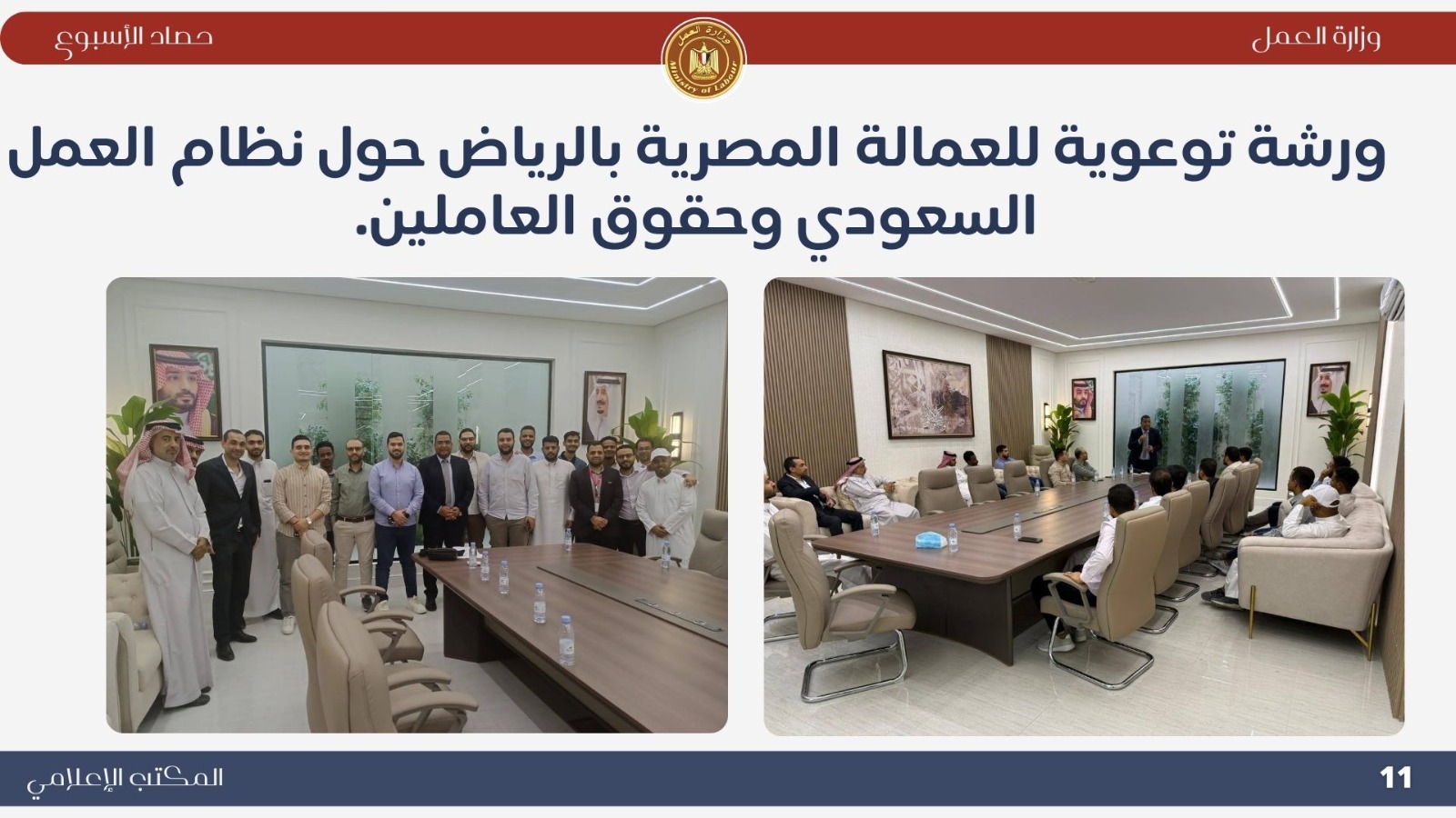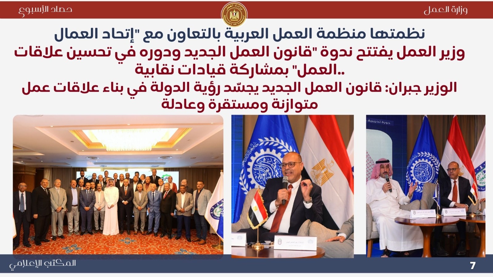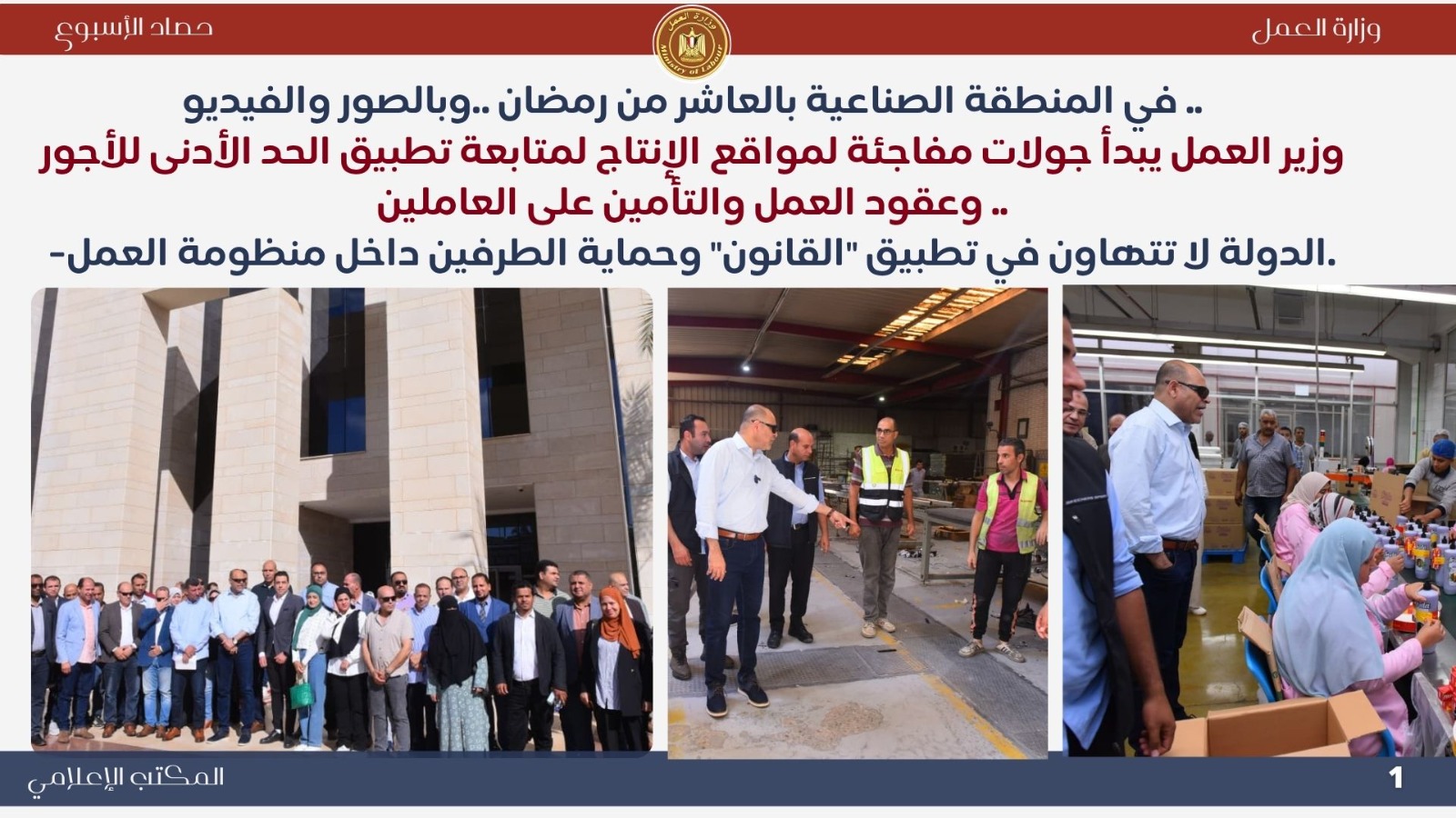 *تعاون خارجي موسع اجتماع وزيري الخارجية والعمل لإنشاء قاعدة بيانات للعمالة المصرية بالخارج..حيث ناقش الوزيران بدر عبد العاطي ومحمد جبران بعض الملفات التي تخص العمالة المصرية بالخارج . *حملات تفتيش ميدانية مكثفة أعلنت اللجنة المركزية للتفتيش بوزارة العمل عن نتائج حملاتها خلال أسبوع واحد، حيث تم التفتيش على 721 منشأة، وتحرير 338 محضر مخالفة، ومنح مهلة لـ 390 منشأة لتصويب الأوضاع. وأكد الوزير جبران استمرار الحملات الميدانية لتطبيق قانون العمل الجديد رقم 14 لسنة 2025 وضمان العدالة في الأجور وصون حقوق العمال. *جولات ميدانية بالعاشر من رمضان تفتيش 100 منشأة وتحرير 138 محضرًا مخالفًا ..حيث قاد الوزير محمد جبران حملة تفتيش موسعة داخل المنطقة الصناعية بالعاشر من رمضان شملت 100 منشأة، أسفرت عن 67 مخالفة للحد الأدنى للأجور و71 مخالفة لتصاريح الأجانب، مع منح مهلة لتوفيق أوضاع 76 منشأة. وأكد أن الوزارة تتبع نهجًا يجمع بين الرقابة الصارمة والتوعية لتحقيق بيئة عمل عادلة وآمنة. *وقف شركتين عن العمل لمخالفتهما قانون العمل الجديد توجّه الوزير محمد جبران ميدانيًا إلى مواقع عمل بعد رفض شركتين إجراءات التفتيش، وأصدر قرارًا بوقف العمل الفوري لحين استيفاء اشتراطات السلامة، مشددًا على أن الوزارة لن تتهاون مع المخالفين حمايةً لأرواح العمال وحقوقهم. *تطوير مراكز السلامة والصحة المهنية تحويل مسرح المركز القومي لمنارة تدريبية جديدة...حيث قام الوزير محمد جبران بجولة في المركز القومي لدراسات السلامة والصحة المهنية لمتابعة تطوير أقسامه وتجهيز المسرح ليصبح منارة للتدريب والتوعية في مجالات السلامة المهنية، مؤكدًا أن المركز يعد ذراعًا رئيسيًا للوزارة في نشر ثقافة الوقاية وحماية العمال. *ملتقى التوظيف التكنولوجي "هواوي 6" شارك الوزير محمد جبران في افتتاح ملتقى "HiRE 6" الذي نظمته شركة هواوي بالتعاون مع وزارتي العمل والاتصالات، بمشاركة أكثر من 100 شركة. وأكد أن الملتقى يجسد شراكة الدولة والقطاع الخاص في تمكين الشباب وتأهيلهم لقيادة التحول الرقمي، مشيرًا إلى أن الوزارة تركز على برامج التدريب التحويلي والمهارات التكنولوجية وفقًا لرؤية مصر 2030. *التوعية بقانون العمل الجديد افتتح الوزير محمد جبران ندوة بعنوان "قانون العمل رقم 14 لسنة 2025 ودوره في تحسين علاقات العمل"، بمشاركة قيادات عمالية من مختلف المحافظات. وأكد أن القانون جاء ثمرة حوار مجتمعي واسع ويمثل نقلة نوعية في تحقيق التوازن بين العمال وأصحاب الأعمال، ودعم الاستثمار وتحسين بيئة العمل. *متابعة ميدانية للقانون الجديد واصل الوزير محمد جبران جولاته المفاجئة في التجمع والمولات ومحطات الوقود، مؤكدًا عدم التهاون في تطبيق قانون العمل الجديد وضمان حقوق العمال. *حملات السلامة المهنية كشف تقرير الإدارة المركزية للسلامة المهنية عن تفتيش 2298 منشأة خلال أكتوبر، وتحرير 1740 محضر مخالفة، وإيقاف العمل في منشأتين وغلق منشأة واحدة لوجود خطر داهم، تنفيذًا لتوجيهات القيادة السياسية بتوفير بيئة عمل آمنة ولائقة. *وزير العمل يشارك في احتفالية اليوم الوطني التركي نيابةً عن دولة رئيس الوزراء، شارك الوزير محمد جبران في احتفالية اليوم الوطني للجمهورية التركية، مؤكدًا عمق العلاقات المصرية–التركية وأهمية البناء على الخطوات الإيجابية التي تحققت بين البلدين في مجالات الاقتصاد والتعليم والثقافة والطاقة. *فرص عمل جديدة أعلنت وزارة العمل نشرة التوظيف نصف الشهرية متضمنة 6721 فرصة عمل في 107 شركة خاصة بـ 16 محافظة، تشمل وظائف متنوعة لذوي الخبرة وحديثي التخرج، مع فرص مخصصة لذوي الهمم، تنفيذًا لتوجيهات القيادة السياسية بتوفير فرص عمل لائقة ومستمرة للشباب.