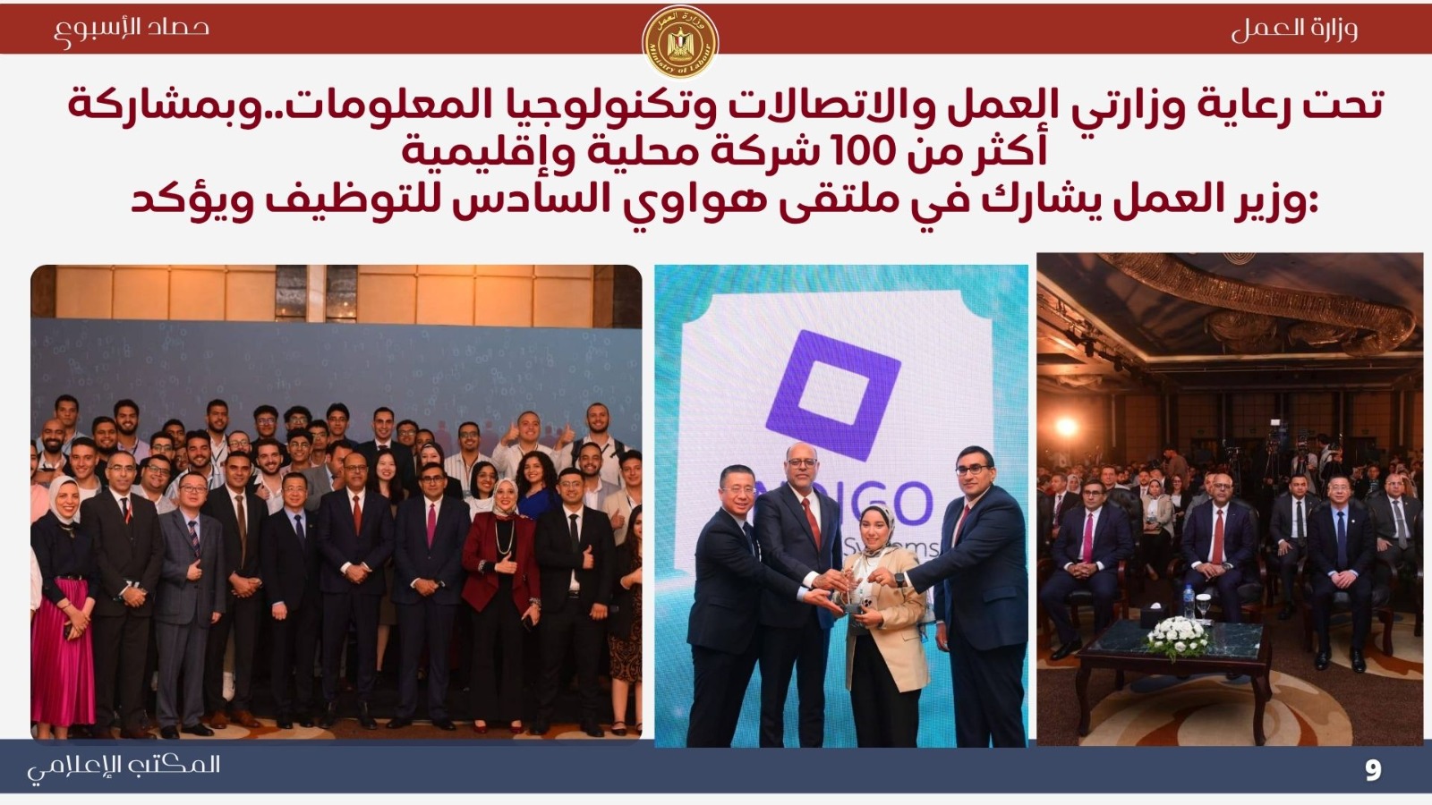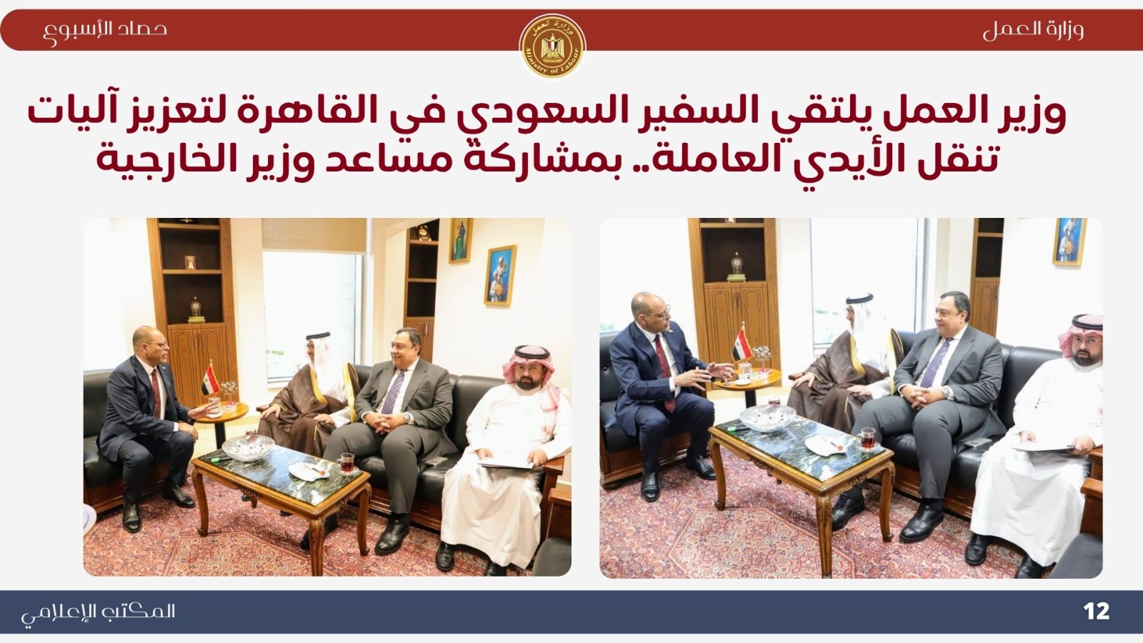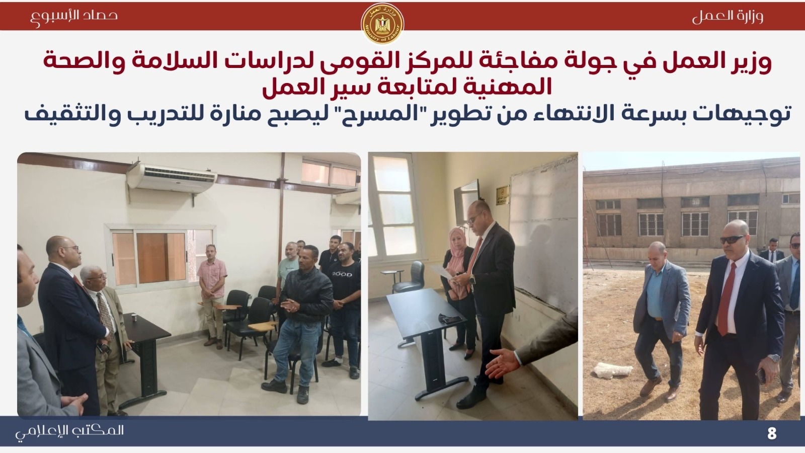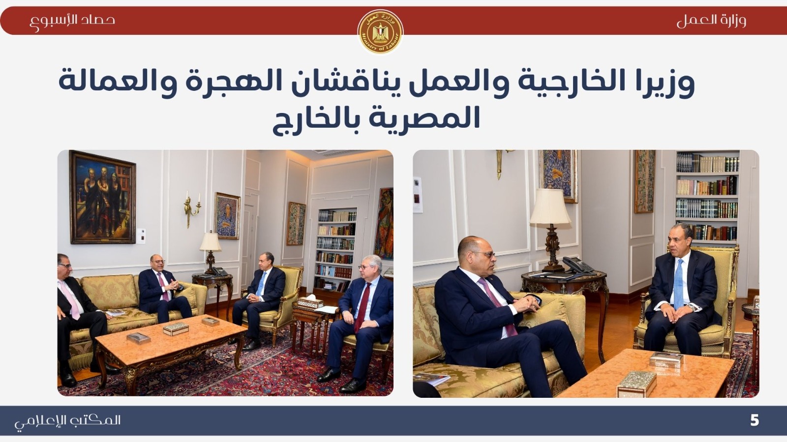 *تعاون خارجي موسع اجتماع وزيري الخارجية والعمل لإنشاء قاعدة بيانات للعمالة المصرية بالخارج..حيث ناقش الوزيران بدر عبد العاطي ومحمد جبران بعض الملفات التي تخص العمالة المصرية بالخارج . *حملات تفتيش ميدانية مكثفة أعلنت اللجنة المركزية للتفتيش بوزارة العمل عن نتائج حملاتها خلال أسبوع واحد، حيث تم التفتيش على 721 منشأة، وتحرير 338 محضر مخالفة، ومنح مهلة لـ 390 منشأة لتصويب الأوضاع. وأكد الوزير جبران استمرار الحملات الميدانية لتطبيق قانون العمل الجديد رقم 14 لسنة 2025 وضمان العدالة في الأجور وصون حقوق العمال. *جولات ميدانية بالعاشر من رمضان تفتيش 100 منشأة وتحرير 138 محضرًا مخالفًا ..حيث قاد الوزير محمد جبران حملة تفتيش موسعة داخل المنطقة الصناعية بالعاشر من رمضان شملت 100 منشأة، أسفرت عن 67 مخالفة للحد الأدنى للأجور و71 مخالفة لتصاريح الأجانب، مع منح مهلة لتوفيق أوضاع 76 منشأة. وأكد أن الوزارة تتبع نهجًا يجمع بين الرقابة الصارمة والتوعية لتحقيق بيئة عمل عادلة وآمنة. *وقف شركتين عن العمل لمخالفتهما قانون العمل الجديد توجّه الوزير محمد جبران ميدانيًا إلى مواقع عمل بعد رفض شركتين إجراءات التفتيش، وأصدر قرارًا بوقف العمل الفوري لحين استيفاء اشتراطات السلامة، مشددًا على أن الوزارة لن تتهاون مع المخالفين حمايةً لأرواح العمال وحقوقهم. *تطوير مراكز السلامة والصحة المهنية تحويل مسرح المركز القومي لمنارة تدريبية جديدة...حيث قام الوزير محمد جبران بجولة في المركز القومي لدراسات السلامة والصحة المهنية لمتابعة تطوير أقسامه وتجهيز المسرح ليصبح منارة للتدريب والتوعية في مجالات السلامة المهنية، مؤكدًا أن المركز يعد ذراعًا رئيسيًا للوزارة في نشر ثقافة الوقاية وحماية العمال. *ملتقى التوظيف التكنولوجي "هواوي 6" شارك الوزير محمد جبران في افتتاح ملتقى "HiRE 6" الذي نظمته شركة هواوي بالتعاون مع وزارتي العمل والاتصالات، بمشاركة أكثر من 100 شركة. وأكد أن الملتقى يجسد شراكة الدولة والقطاع الخاص في تمكين الشباب وتأهيلهم لقيادة التحول الرقمي، مشيرًا إلى أن الوزارة تركز على برامج التدريب التحويلي والمهارات التكنولوجية وفقًا لرؤية مصر 2030. *التوعية بقانون العمل الجديد افتتح الوزير محمد جبران ندوة بعنوان "قانون العمل رقم 14 لسنة 2025 ودوره في تحسين علاقات العمل"، بمشاركة قيادات عمالية من مختلف المحافظات. وأكد أن القانون جاء ثمرة حوار مجتمعي واسع ويمثل نقلة نوعية في تحقيق التوازن بين العمال وأصحاب الأعمال، ودعم الاستثمار وتحسين بيئة العمل. *متابعة ميدانية للقانون الجديد واصل الوزير محمد جبران جولاته المفاجئة في التجمع والمولات ومحطات الوقود، مؤكدًا عدم التهاون في تطبيق قانون العمل الجديد وضمان حقوق العمال. *حملات السلامة المهنية كشف تقرير الإدارة المركزية للسلامة المهنية عن تفتيش 2298 منشأة خلال أكتوبر، وتحرير 1740 محضر مخالفة، وإيقاف العمل في منشأتين وغلق منشأة واحدة لوجود خطر داهم، تنفيذًا لتوجيهات القيادة السياسية بتوفير بيئة عمل آمنة ولائقة. *وزير العمل يشارك في احتفالية اليوم الوطني التركي نيابةً عن دولة رئيس الوزراء، شارك الوزير محمد جبران في احتفالية اليوم الوطني للجمهورية التركية، مؤكدًا عمق العلاقات المصرية–التركية وأهمية البناء على الخطوات الإيجابية التي تحققت بين البلدين في مجالات الاقتصاد والتعليم والثقافة والطاقة. *فرص عمل جديدة أعلنت وزارة العمل نشرة التوظيف نصف الشهرية متضمنة 6721 فرصة عمل في 107 شركة خاصة بـ 16 محافظة، تشمل وظائف متنوعة لذوي الخبرة وحديثي التخرج، مع فرص مخصصة لذوي الهمم، تنفيذًا لتوجيهات القيادة السياسية بتوفير فرص عمل لائقة ومستمرة للشباب.