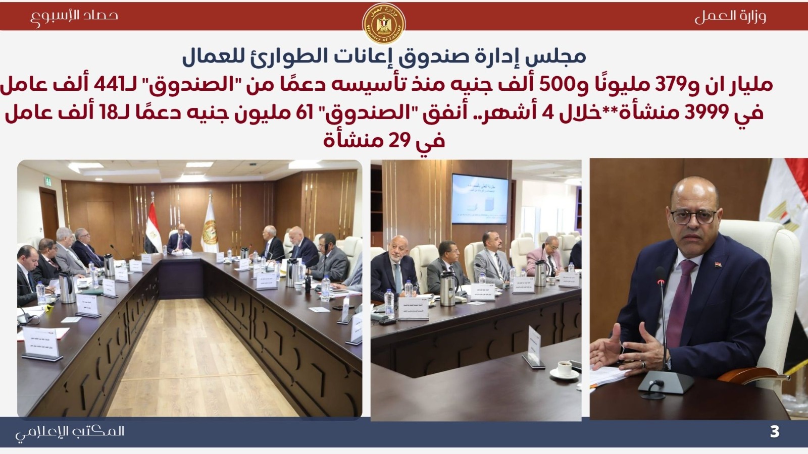 دعم صندوق إعانات الطوارئ للعمال برئاسة وزير العمل محمد جبران أن الصندوق أنفق 2.379 مليار جنيه دعمًا لـ 441 ألف عامل في 3999 منشأة منذ تأسيسه عام 2002، منها 61 مليون جنيه خلال 4 أشهر فقط لدعم 18 ألف عامل. وأكد الوزير أن الصندوق مستمر في دوره القومي والإنساني لدعم العمال والمنشآت المتضررة تنفيذًا لتوجيهات الرئيس عبدالفتاح السيسي بتوفير مظلة حماية اجتماعية شاملة للعمال.