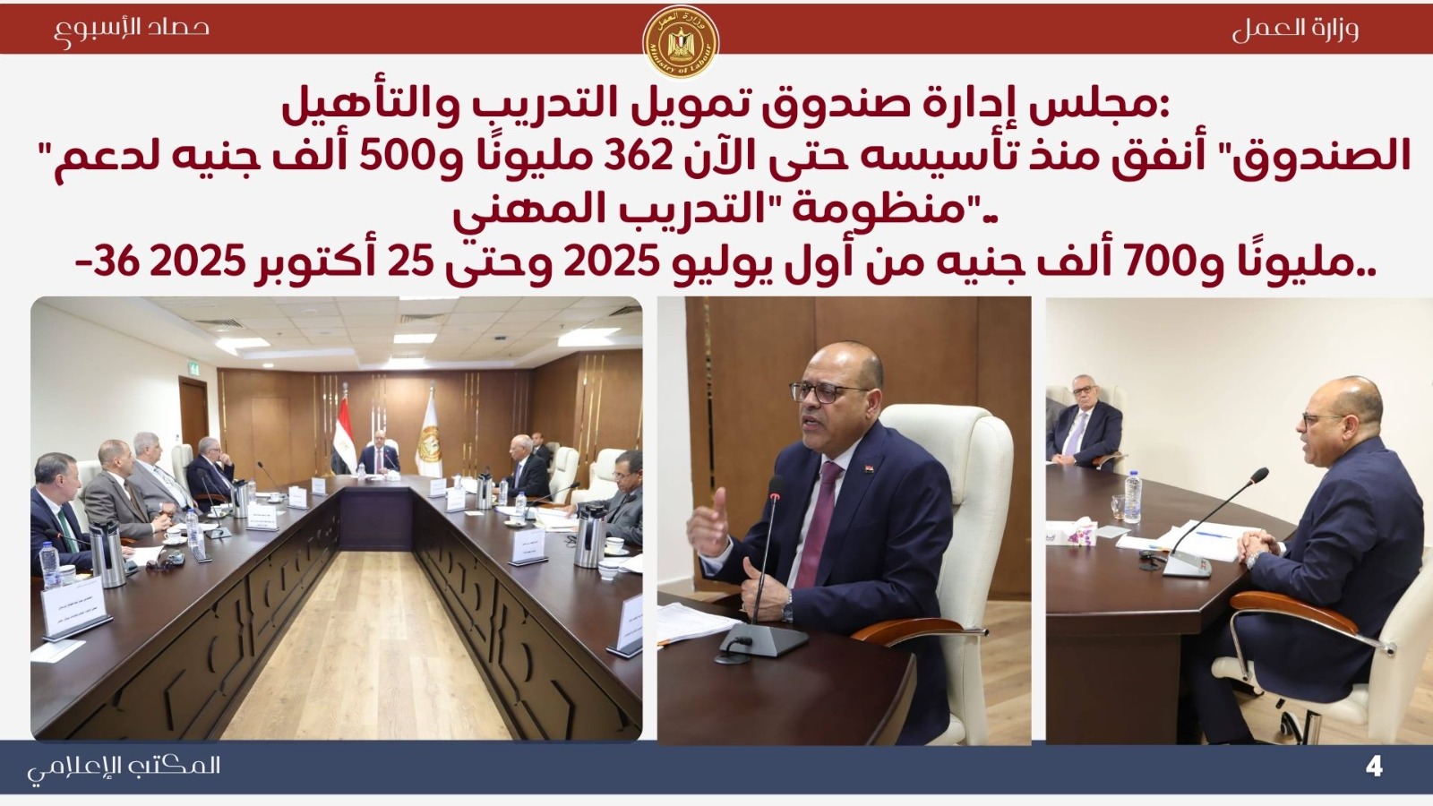 أعلن مجلس إدارة صندوق تمويل التدريب والتأهيل برئاسة وزير العمل محمد جبران أن الصندوق أنفق 36.7 مليون جنيه خلال 4 أشهر، ليصل إجمالي ما تم إنفاقه منذ تأسيسه إلى 362.5 مليون جنيه لدعم منظومة التدريب المهني وإنشاء وتطوير المراكز والوحدات التدريبية، تنفيذًا لتوجيهات القيادة السياسية بتأهيل الشباب لسوق العمل المحلي والدولي. *تنسيق مصري–سعودي تنظيم تنقل العمالة الموسمية واستعدادات موسم الحج..حيث بحث وزير العمل محمد جبران مع سفير السعودية بالقاهرة صالح بن عيد الحصيني آليات تنظيم تنقل العمالة المصرية إلى المملكة، وتعزيز الربط الإلكتروني بين الجانبين، ومناقشة حوكمة العمالة الموسمية استعدادًا لموسم الحج، مع الإشادة ببرنامج الفحص المهني المشترك الذي يرفع كفاءة العمالة المصرية المتجهة للسعودية.