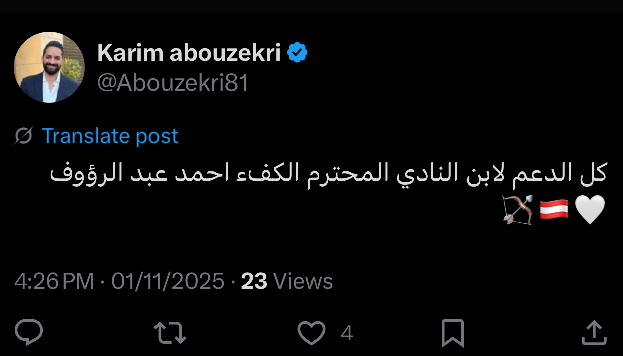 وكتب أبوذكرى عبر حسابه الشخصي بموقع إكس “تويتر سابقًا”: “كل الدعم لابن النادي المحترم الكفء أحمد عبدالرؤوف ”.