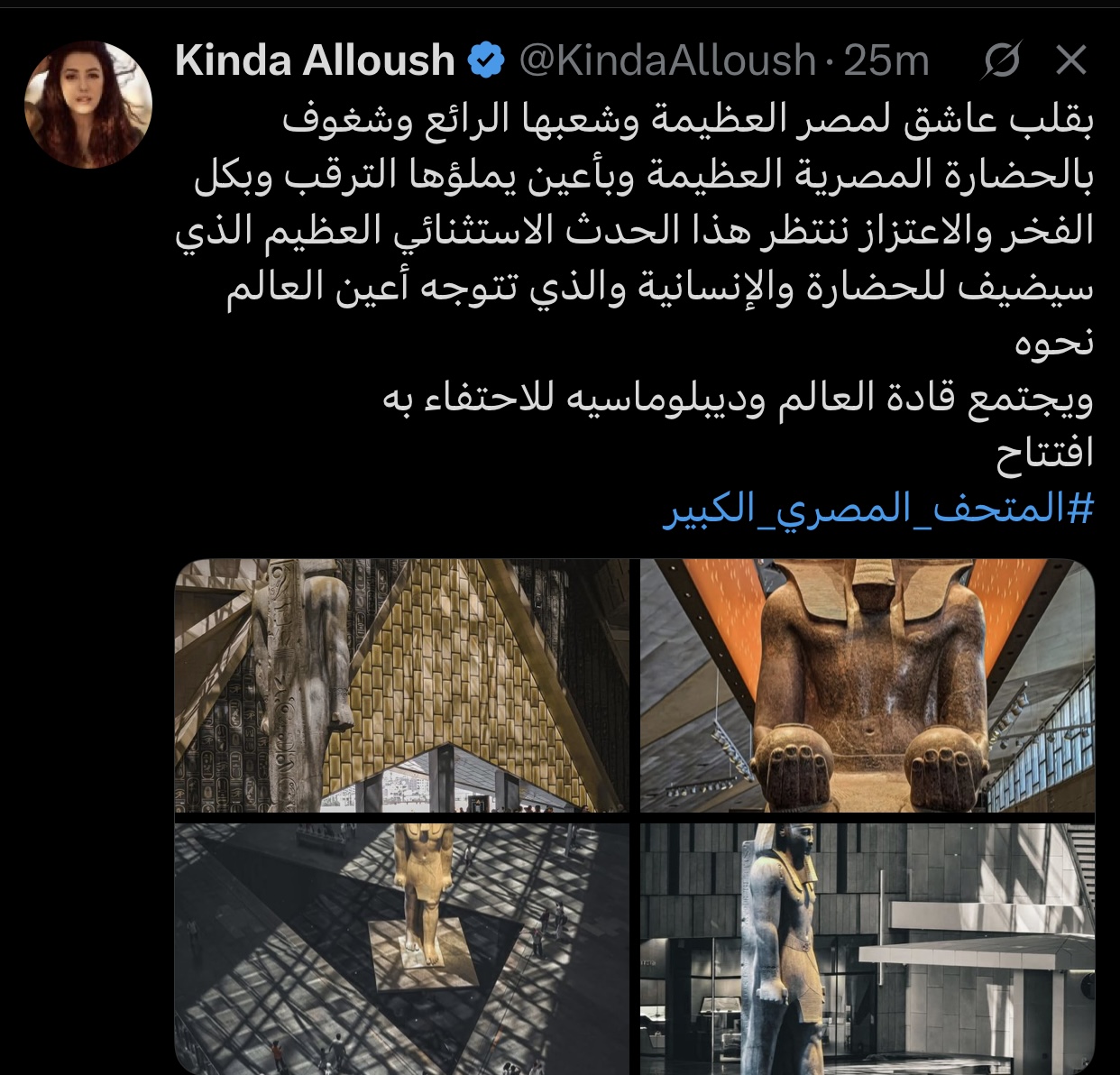 عبّرت الفنانة كندة علوش عن حماسها الكبير واعتزازها بمصر وحضارتها، وذلك تزامنًا مع افتتاح المتحف المصري الكبير، أحد أهم الصروح الثقافية في العالم.